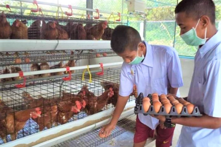 ที่ศูนย์ฯเลี้ยงไก่ไข่จำนวน 120 ตัว โดยสามารถบริหารจัดการผลผลิต ด้วยการนำไข่ไก่ไปเป็นอาหารกลางวันให้กับเด็กๆ ในภาวะปกติ รวมถึงในช่วงโควิดระบาด ที่ต้องหยุดการเรียนการสอนและสอนผ่านออนไลน์แทน ศูนย์ฯนำไข่ไก่ ข้าวสารและน้ำมันพืช แจกให้ผู้ปกครองนำไปปรุงอาหารให้กับนักเรียนได้รับประทานที่บ้าน ขณะเดียวกัน ยังจำหน่ายไข่ไก่ให้ผู้ปกครองในราคา 80-85 บาทต่อแผง 30 ฟอง ราคาถูกกว่าท้องตลาด เพื่อช่วยลดค่าครองชีพ รวมถึงจำหน่ายให้กับศูนย์การเรียนรู้ในพื้นที่อื่นๆ ทำให้สามารถบริหารการผลิตและการตลาดเพื่อให้มีผลกำไรเป็นทุนต่อไปได้