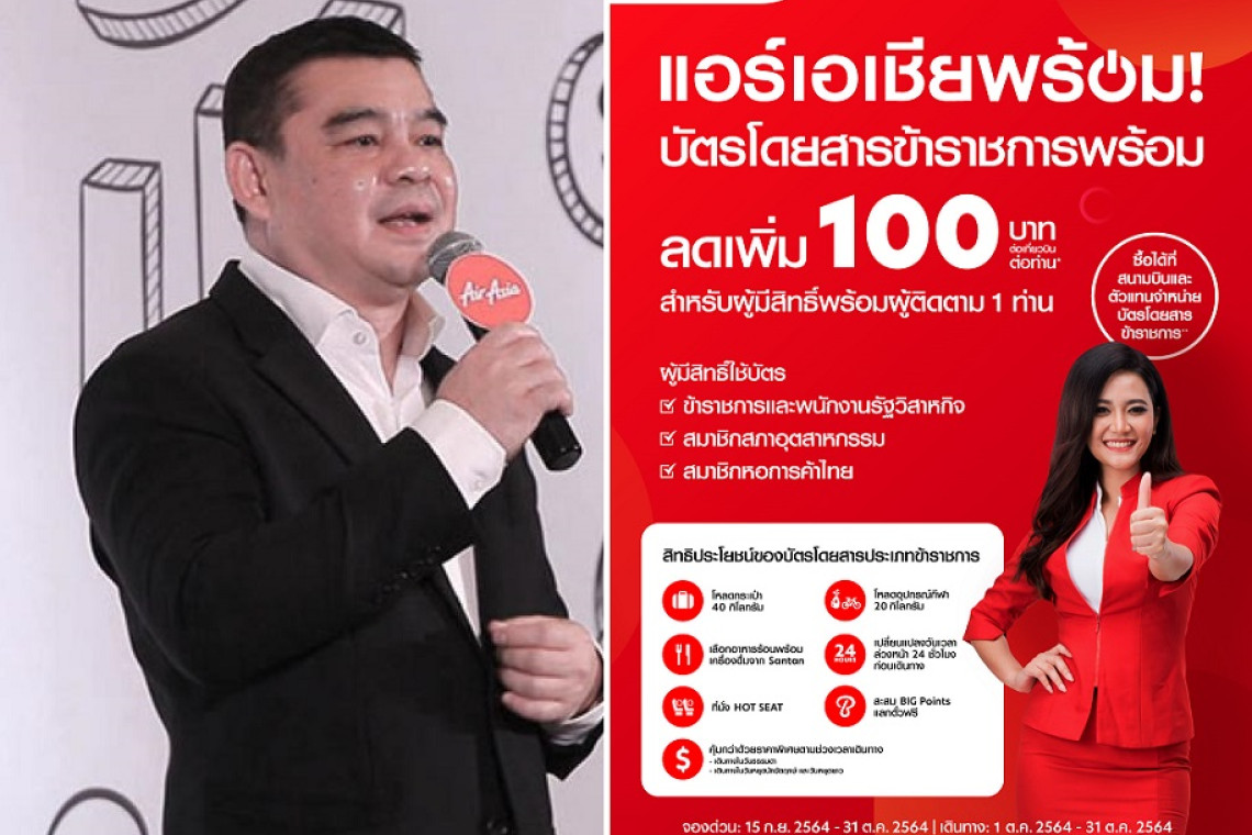 แอร์เอเชีย จัดโปรโมชั่น สำหรับผู้ถือบัตรข้าราชการ พนักงานรัฐวิสาหกิจ สมาชิกสภาอุตสาหกรรม สมาชิกหอการค้าไทย พร้อมผู้ติดตาม 1 ท่าน ลดเพิ่มทันที 100 บาทต่อเที่ยวบินต่อท่าน พร้อมสิทธิประโยชน์มากมาย ทั้งโหลดกระเป๋าฟรี 40 กิโลกรัม โหลดอุปกรณ์กีฬา ได้ 20 กิโลกรัม รับอาหารและเครื่องดื่มจาก AirAsia Santan การเลือกที่นั่ง Hot Seat เปลี่ยนแปลงวันและเวลาล่วงหน้า 24 ชั่วโมงก่อนเดินทาง สะสม Big Point แลกตั๋วฟรี และอีกมากมาย จองด่วนตั้งแต่วันนี้ ถึงวันที่ 31ตุลาคม 2564 เพื่อทางได้ตั้งแต่วันที่ 1ตุลาคม 2564 จนถึงวันที่ 31 ตุลาคม 2564 นี้เท่านั้น