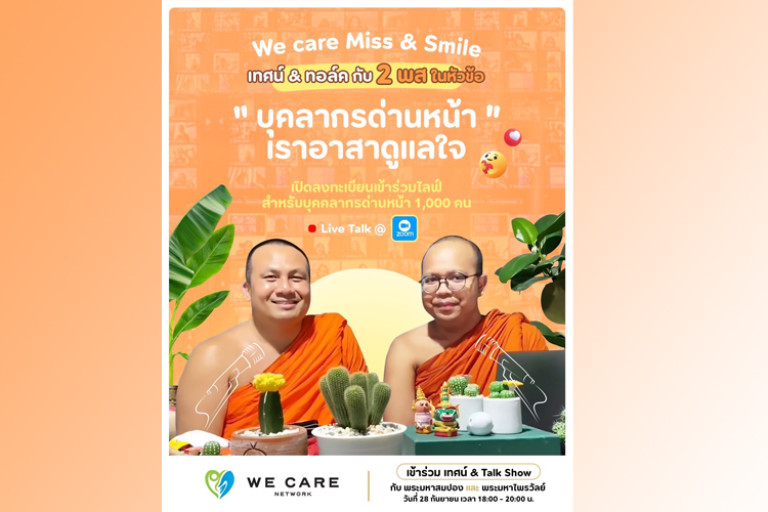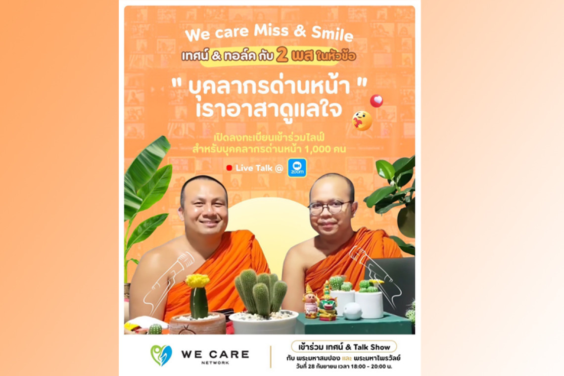 เครือข่ายจิตอาสาโครงการ “We Care Network: เครือข่ายเราดูแลกัน” เตรียมจัดกิจกรรมอาสาดูแลใจบุคลากรทางการแพทย์และบุคลากรด่านหน้าทั่วไทย ที่ทุ่มเทแรงกายและแรงใจช่วยเหลือผู้ป่วย โควิด-19 ตลอดเกือบ 2 ปีที่ผ่านมา กับงานเทศนาการกุศล “WE CARE MISS & SMILE เทศน์ & ทอล์ค กับ 2 พส.” โดย “พระมหาสมปอง ตาลปุตฺโต” และ “พระมหาไพรวัลย์ วรวณฺโณ” ในหัวข้อ “บุคลากรด่านหน้า เราอาสาดูแลใจ” วันอังคารที่ 28 กันยายนนี้ ไลฟ์สดผ่านทางซูม