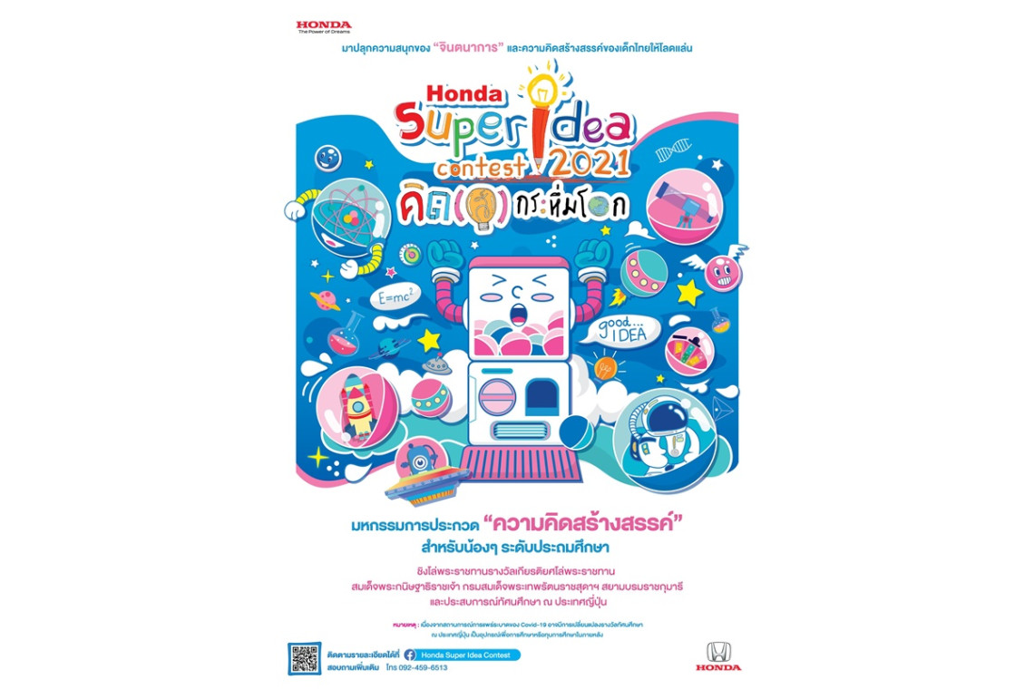 บริษัท ฮอนด้า ออโตโมบิล (ประเทศไทย) จำกัด เดินหน้าสานต่อ โครงการ “ฮอนด้า ซูเปอร์ ไอเดีย คอนเทสต์” ปีที่ 17 ผ่านออนไลน์เต็มรูปแบบเป็นครั้งแรก โดยเชิญชวนเด็กไทย ระดับชั้นประถมศึกษาปีที่ 1 - 6 ทั่วประเทศ ที่มีอายุไม่เกิน 12 ปี ส่งผลงานไอเดียสิ่งประดิษฐ์สุดสร้างสรรค์ ที่มีความแปลกใหม่และเป็นประโยชน์ต่อสังคม ภายใต้แนวคิด “เปิดแคปซูลความฝัน ปลดปล่อยพลังแห่งจินตนาการ สานต่อไอเดียสุดสร้างสรรค์กับฮอนด้า” เพื่อชิงรางวัลโล่พระราชทานสมเด็จพระกนิษฐาธิราชเจ้า กรมสมเด็จพระเทพรัตนราชสุดาฯ สยามบรมราชกุมารี พร้อมทุนการศึกษา และโอกาสเดินทางไปทัศนศึกษา ณ ประเทศญี่ปุ่น*
