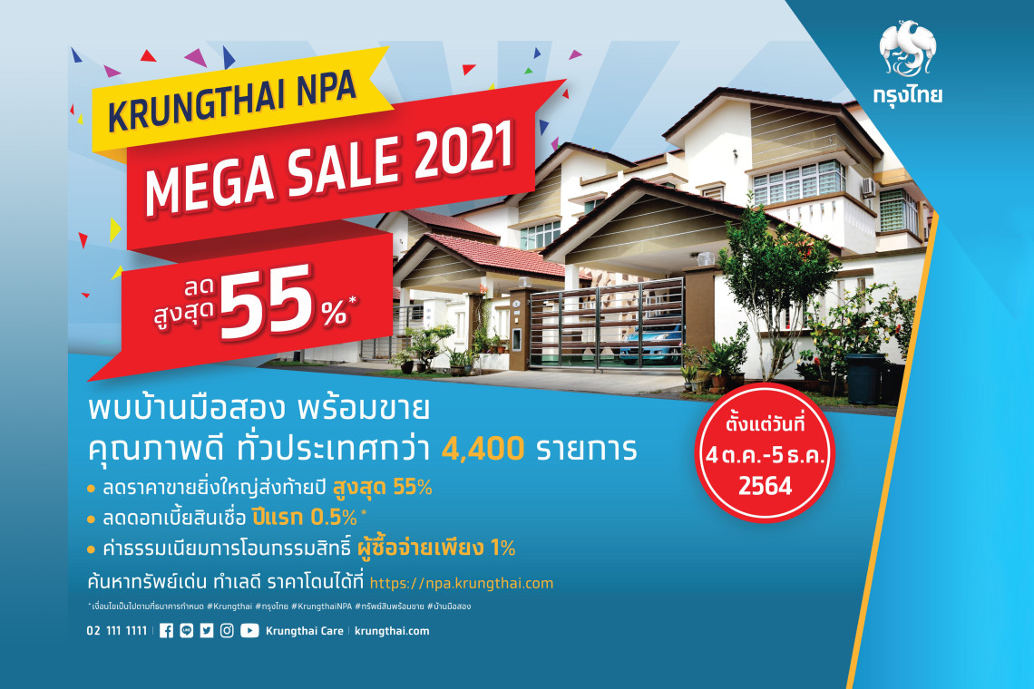 กลับมาในช่วงไตรมาสสุดท้ายของทุกปี สำหรับมหกรรม NPA MEGA Sale หรือทรัพย์สินพร้อมขาย (NPA) ของธนาคารกรุงไทย โดยในปีที่ผ่านๆ มา มีการจัดกิจกรรมขายอสังหาริมทรัพย์มือสองในทำเลต่างๆ อย่างต่อเนื่อง ผ่านช่องทางออนไลน์และสาขาของธนาคารทั่วประเทศ รวมถึงการนำทรัพย์มาจัดรายการลดราคาพิเศษส่งท้ายปี