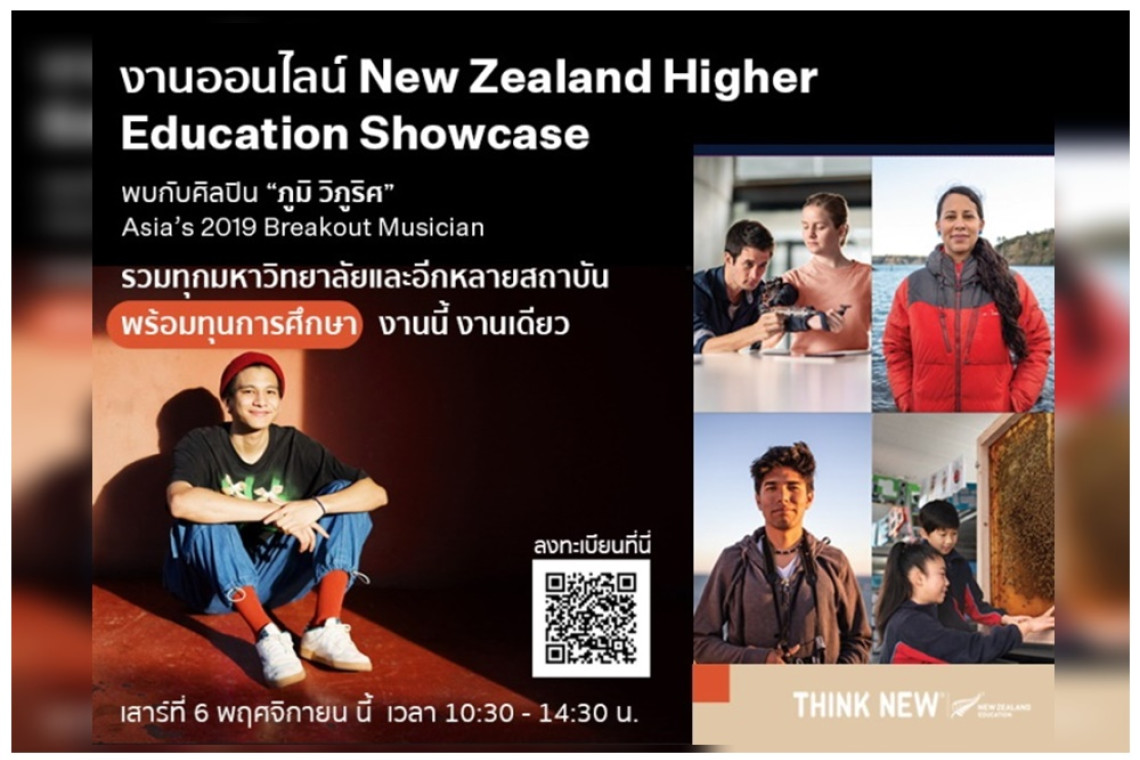 หน่วยงานการศึกษานิวซีแลนด์ (Education New Zealand) สถานทูตนิวซีแลนด์ ประจำประเทศไทย เชิญผู้สนใจร่วมงานแนะแนวการศึกษาออนไลน์ “New Zealand Higher Education Showcase 2021” งานเรียนต่อระดับอุดมศึกษาออนไลน์ วันเสาร์ที่ 6 พฤศจิกายนนี้ ตั้งแต่เวลา 10.30 - 14.30 น.