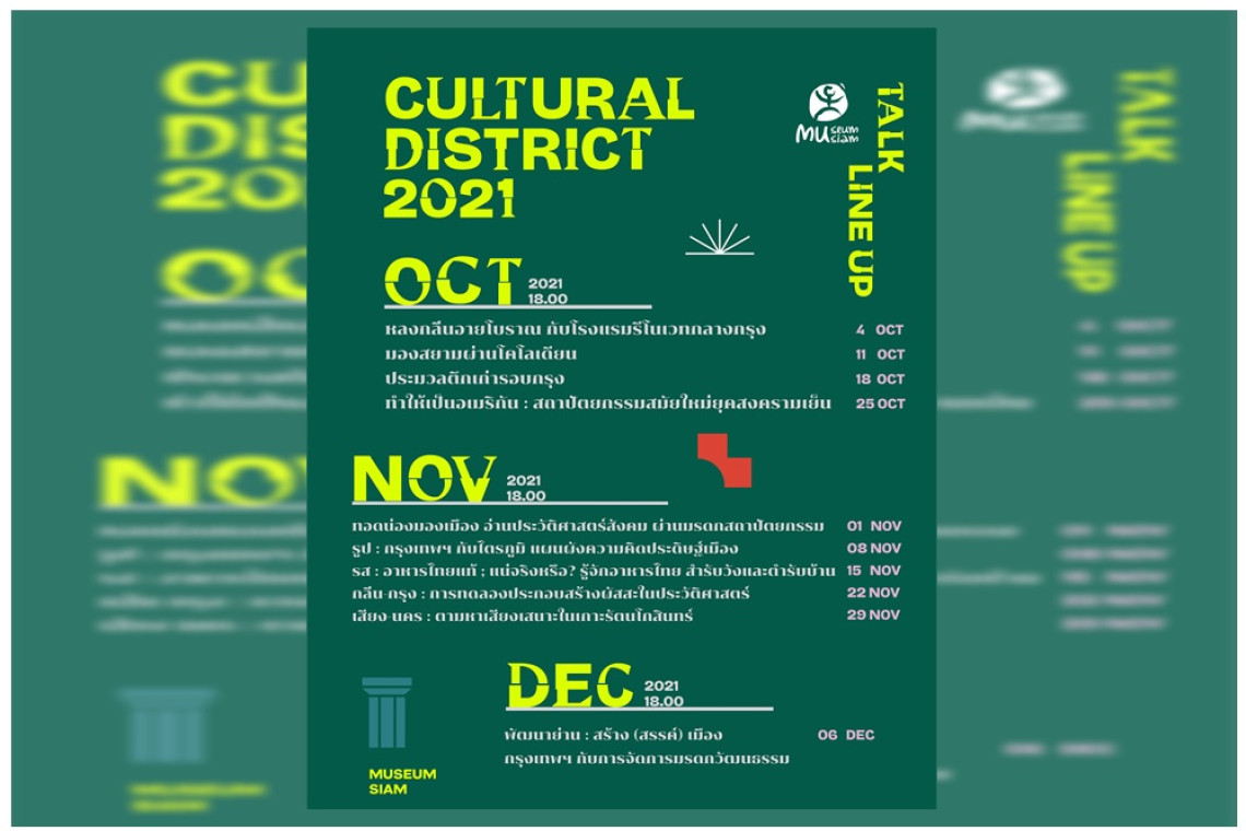 มิวเซียมสยาม ชวนเปิดผัสสะย้อนวันวานชีวิตวิถีบนเกาะรัตนโกสินทร์ไปกับเสวนาออนไลน์ ในโปรเจค “Cultural District 2021 เทศกาลศิลปะเปิดกาะรัตนโกสินทร์” ที่จัดขึ้นในคอนเซป “ติดเกาะกับตึกเก่า” ใน 4 หัวข้อที่น่าสนใจ ดังนี้ รส: อาหารไทยแท้ แน่จริงหรือ? รู้จักอาหารไทย สำรับวังและตำรับบ้าน โดยคุณดวงฤทธิ์ แคล้วปลอดทุกข์ ผู้เชี่ยวชาญด้านมรดกวัฒนธรรมอาหาร ในวันที่ 15 พฤศจิกายน 2564, กลิ่น-กรุง: การทดลองประกอบสร้างผัสสะในประวัติศาสตร์ โดยคุณศรัณย์ ทองปาน นักเขียนสารคดี เมืองโบราณ ในวันที่ 22 พฤศจิกายน 2564, เสียง-นคร: ตามหาเสียงเสนาะในเกาะรัตนโกสินทร์ โดยอาจารย์อัษฎาวุธ สาคริก วิทยาลัยดุริยางคศิลป์ มหาวิทยาลัยมหิดล ในวันที่ 29 พฤศจิกายน 2564 และ พัฒนาย่าน: สร้าง(สรรค์) เมืองกรุงเทพฯ กับการจัดการมรดกทางวัฒนธรรม โดย ผศ. ดร.สุพิชชา โตวิวิชญ์ คณะสถาปัตยกรรมศาสตร์ มหาวิทยาลัยศิลปากร และร้อยตำรวจเอกพงศกร ขวัญเมือง โฆษกกรุงเทพมหานคร ในวันที่ 6 ธันวาคม 2564