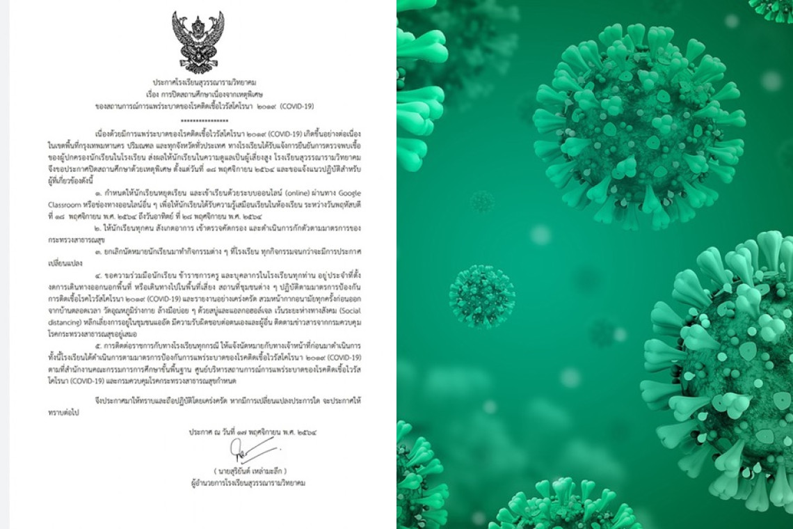 เนื่องด้วยมีการแพร่ระบาดของเชื้อโควิดเกิดขึ้นอย่างต่อเนื่อง ในเขตพื้นที่กทม. ปริมณฑล และทุกจังหวัดทั่วประเทศ ทางโรงเรียนได้รับแจ้งยืนยันการตรวจพบเชื้อของผู้ปกครองนักเรียนในโรงเรียน ส่งผลให้นักเรียนในความดูแลเป็นผู้มีความเสี่ยงสูง โรงเรียนจึงประกาศปิดสถานศึกษาด้วยเหตุพิเศษ ตั้งแต่วันที่ 18 พ.ย.64 โดยให้นักเรียนหยุดเรียนและเข้าเรียนด้วยระบบออนไลน์ ผ่าน Google classroom หรื่อช่องทางออนไลน์อื่นๆ ระหว่าง 18-28 พ.ย.64