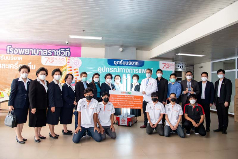 ผศ.สมชาย เวชกรรม รองอธิการบดีฝ่ายกิจการนักศึกษาและศิษย์เก่าสัมพันธ์ รศ.ดร.ธีรวัช บุณยโสภณ ผู้ช่วยอธิการบดีฝ่ายกิจการนักศึกษาและศิษย์เก่าสัมพันธ์ อาจารย์ ดร.สราวุฒิ สืบแย้ม ผู้ช่วยอธิการบดีฝ่ายการคลังและกิจการทั่วไป พร้อมด้วยคุณภรณี ลีนุตพงษ์ กรรมการสภามหาวิทยาลัยผู้ทรงคุณวุฒิ และทีมผู้วิจัย รศ.ดร.ศุภชัย ตระกูลทรัพย์ทวี มหาวิทยาลัยเทคโนโลยีพระจอมเกล้าพระนครเหนือ (มจพ.) ร่วมมอบหุ่นยนต์ประดู่แดงฉายแสง UVC รับมอบโดย นพ.ทัศนชาติ จิตรีธาตุ รองผู้อำนวยการด้านอำนวยการ โรงพยาบาลราชวิถี สนับสนุนโดยอารยา ชัยวัฒนศิริกูล ผู้พิพากษาสมทบศาลเยาวชนและครอบครัวจังหวัดนนทบุรี เพื่อใช้เป็นอุปกรณ์สำหรับการป้องกันควบคุมโรคติดเชื้อไวรัสโคโรนา 2019 (COVID-19) และโรคติดเชื้ออื่นๆ เมื่อเร็วๆ นี้