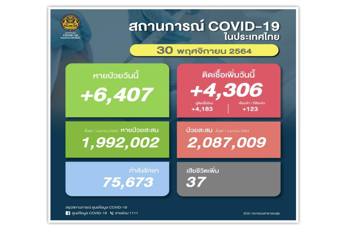 วันที่ 30 พ.ย.2564 ศูนย์ข้อมูล COVID-19 รายงานยอดผู้ติดเชื้อโควิด-19 รายใหม่จำนวน 4,306 ราย จำแนกเป็น ติดเชื้อใหม่ 4,183 ราย ติดเชื้อภายในเรือนจำ/ที่ต้องขัง 123 ราย ทำให้ยอดผู้ป่วยสะสมตั้งแต่ 1 เมษายน-ปัจจุบัน มีจำนวน 2,087,009 ราย หายป่วยกลับบ้าน 6,407 ราย เสียชีวิต 37 ราย รวมเสียชีวิตสะสมตั้งแต่ 1 เมษายน-ปัจจุบัน จำนวน 20,677 ราย