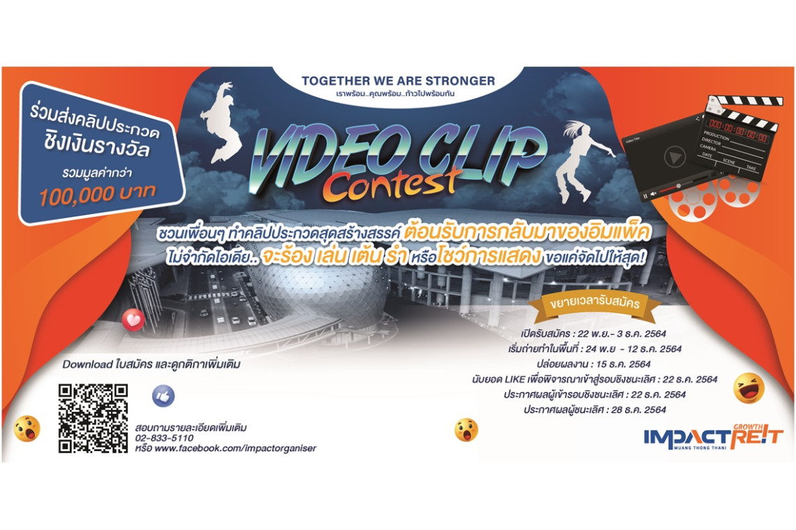 อิมแพ็ค เชิญชวนผู้มีไอเดียสร้างสรรค์ร่วมส่งผลงาน Clip VDO ประกวดในหัวข้อ Together we are stronger เราพร้อม..คุณพร้อม..ก้าวไปพร้อมกัน เพื่อประชาสัมพันธ์ศูนย์แสดงสินค้าและการประชุม อิมแพ็ค เมืองทองธานี ในโอกาสกลับมาเปิดบริการพื้นที่จัดงานได้อีกครั้ง เพียงเลือกโลเคชั่นที่ชอบรอบ อิมแพ็ค เมืองทองธานี 12 จุดที่กำหนดไม่ว่าจะเป็น อิมแพ็ค อารีน่า, อิมแพ็ค ฟอรั่ม, อิมแพ็ค ชาเลนเจอร์, โนโวเทล กรุงเทพ อิมแพ็ค, อิมแพ็ค สปีดพาร์ค, อิมแพ็ค เลคฟร้อนท์, เดอะ พอร์ทอล ฯลฯ แล้วใส่ไอเดียการแสดงไม่ว่าจะร้อง เล่น เต้น รำ มาเดี่ยว มาคู่ มากลุ่ม รุ่นไหนก็จัดไปให้สุด เพื่อคว้าเงินรางวัลรวมมูลค่ากว่า 100,000 บาท เปิดรับสมัครและส่งผลงานเข้าประกวดได้ตั้งแต่วันนี้จนถึง 15 ธันวาคม ศกนี้ ผู้สนใจสมัครออนไลน์ติดตามกติกาทั้งหมดเพียงสแกน QR Code หรือสอบถามข้อมูลเพิ่มเติมโทร.0-2833-5110