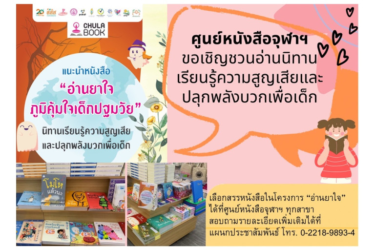ศูนย์หนังสือจุฬาลงกรณ์มหาวิทยาลัย ในฐานะหน่วยงานทีมีพันธกิจหลักในการสร้างสังคมไทยให้เป็นสังคมแห่งการอ่านและการเรียนรู้ จึงร่วมเป็นภาคีเครือข่ายเผยแพร่หนังสือ ในโครงการ “อ่านยาใจ” จากทุกสำนักพิมพ์ สามารถเลือกสรรหนังสือในโครงการ “อ่านยาใจ” ได้ที่ศูนย์หนังสือจุฬาฯ ทุกสาขา สอบถามรายละเอียดเพิ่มเติมได้ที่ แผนกประชาสัมพันธ์ โทร. 0-2218-9893-4
