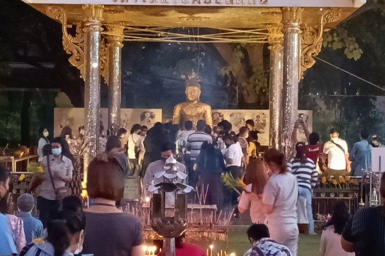 ต่างพากันเดินทางเข้ามานมัสการพระพุทธรูปปางมารวิชัย หรือ “หลวงพ่อปลดหนี้” ด้วยการจุดธูปเทียนบูชา และปิดทององค์พระ ก่อนที่จะขอพรให้ประสบความสำเร็จจากการเสี่ยงทายตัวเลขตามความเชื่อ ด้วยการเขย่าหาหมายเลขจากเซียมซี และล้วงควานหาตัวเลขบอลไข่จากในไห เพื่อให้ได้หมายเลขที่ต้องการแสวงหา ในการนำไปเสี่ยงทายกับผลของการออกเลขสลากกินแบ่งรัฐบาลกันอย่างเนื่องแน่น ตั้งแต่ช่วงเช้าตรู่ของวันนี้ต่อเนื่องจนถึงในช่วงพลบค่ำ