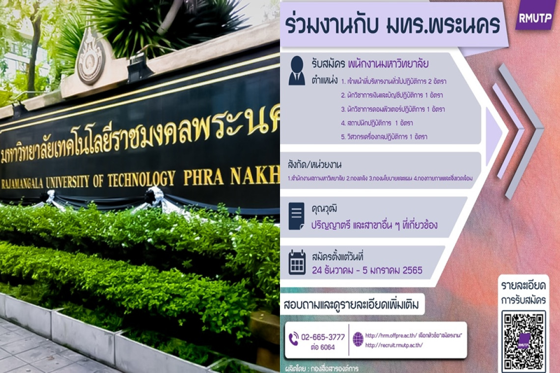 มหาวิทยาลัยเทคโนโลยีราชมงคลพระนคร เปิดรับสมัครพนักงานมหาวิทยาลัย ประกอบด้วย ตำแหน่งเจ้าหน้าที่บริหารงานทั่วไปปฏิบัติการ สังกัดงานสภามหาวิทยาลัย คุณวุฒิปริญญาตรีทุกสาขาวิชา ตำแหน่งนักวิชาการเงินและบัญชีปฏิบัติการ สังกัดกองคลัง คุณวุฒิปริญญาตรีการบัญชี การเงิน บริหารธุรกิจบัณฑิต การจัดการ ตำแหน่งนักวิชาการคอมพิวเตอร์ปฏิบัตการ สังกัดกองนโยบายและแผน คุณวุฒิปริญญาตรี วิศวกรรมศาสตร์ วิทยาศาสตร์ วิทยาการคอมพิวเตอร์ หรือเทคโนโลยีสารสนเทศ ตำแหน่งเจ้าหน้าที่บริหารงานทั่วไปปฏิบัติการ สังกัดกองนโยบายและแผน คุณวุฒิปริญญาตรีทุกสาขาวิชา ตำแหน่งสถาปนิกปฏิบัติการ สังกัดกองนโยบายและแผน คุณวุฒิปริญญาตรี สถาปัตยกรรมศาสตร์ ตำแหน่งวิศวกรเครื่องกลปฏิบัติการ สังกัดกองกายภาพและสิ่งแวดล้อม คุณวุฒิปริญญาตรี วิศวกรรมเครื่องกล