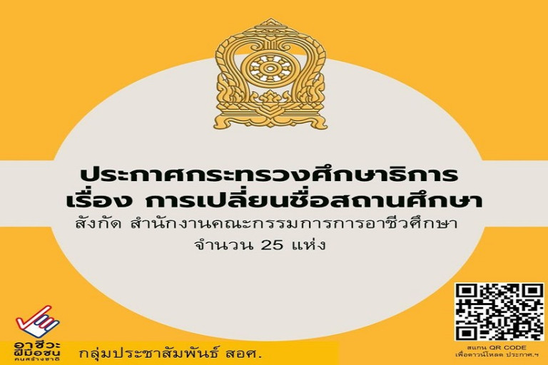 กระทรวงศึกษาธิการ ออกประกาศเรื่อง การเปลี่ยนชื่อสถานศึกษาสังกัดสำนักงานคณะกรรมการการอาชีวศึกษา จำนวน 25 แห่ง ดังนี้