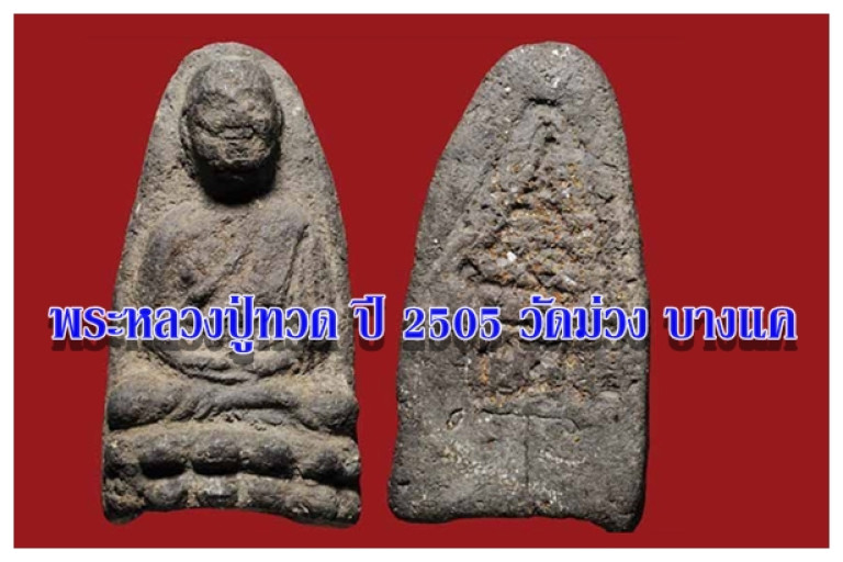 ส่วนที่มาของชื่อวัดม่วงนั้น เนื่องจากบริเวณหน้าวัด ติดคลองภาษีเจริญ เป็นเส้นทางลำเลียงพืชผลทางการเกษตรสู่พระนคร เมื่อถึงบริเวณหลักสอง คลองจะตื้นเขินไม่สามารถสัญจรต่อไปได้ ทำให้ต้องนำผลไม้ขึ้นมาตากบริเวณลานวัด ส่วนใหญ่เป็นมะม่วง เนื่องจากบางส่วนจะสุกงอมอาจเน่าเสีย ชาวบ้านจึงเรียกว่า "วัดมะม่วง" จนต่อมากลายเป็นวัดม่วงในปัจจุบัน การสร้างพระเครื่องรูปหลวงปู่ทวดครั้งนี้ เกิดจากความศรัทธาของ พระอาจารย์ยิ้ม อาภาธโร ซึ่งได้เดินทางไปศึกษาธรรมทางภาคใต้อยู่ช่วงหนึ่ง ได้ไปเป็นศิษย์ศึกษาธรรมกับท่านพระอาจารย์ทิม แห่งวัดช้างให้ จึงมีความคิดที่จะสร้างพระบูชาขนาดใหญ่ เพื่อประดิษฐานไว้ที่วัดม่วง บางแค กรุงเทพฯ พร้อมกับสร้างพระเครื่องเพื่อให้ประชาชนบูชา จึงได้ขออนุญาตพระครูปัญญาวรคุณ เจ้าอาวาสในขณะนั้น และขอให้พระอาจารย์ทิมมาดำเนินการให้ ซึ่งพระคุณเจ้าทั้งสองก็ยินดีเป็นธุระจัดการให้ตามความประสงค์ จากเอกสารการจัดสร้างพระหลวงปู่ทวดของวัดม่วงนั้นมีพิมพ์ทรงต่างๆ หลายพิมพ์ บางพิมพ์มีมาก บางพิมพ์มีน้อย แล้วแต่การกดพิมพ์ในสมัยนั้น ซึ่งใช้วิธีโบราณ แต่มีพระเนื้อว่านพิมพ์เล็ก รวมพิมพ์ได้ถึง 21 พิมพ์ สร้างเท่าพ.ศ.ในสมัยนั้น