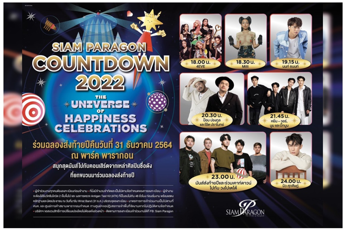 ขอเชิญทุกท่านร่วมบันทึกความทรงจำแห่งความสุขในวันสุดท้ายของปี 31 ธ.ค.64 ด้วยโชว์สุดพิเศษจากศิลปินแถวหน้าของเมืองไทย อาทิ 4EVE เกิร์ลกรุ๊ปมาแรงแห่งปี, มิลลิ แรปเปอร์สาวสุดฮอต, นนท์-ธนนท์, โอ๊ต-ปราโมทย์ ควงคู่มากับ ป๊อบ-ปองกูล, หยิ่น-วอร์ และ บูม-บิ๊กบูม 4 หนุ่มจาก Rookie Thailand และร่วมนับถอยหลังไปกับศิลปินร็อกจากวง โปเตโต้ พร้อมมันส์ข้ามปีไปกับ มิว-ศุภศิษฎ์ โดยคอนเสิร์ตจะเริ่มตั้งแต่เวลา 18.00 น. เป็นต้นไป ณ พาร์ค พารากอน ชั้น M ศูนย์การค้าสยามพารากอน