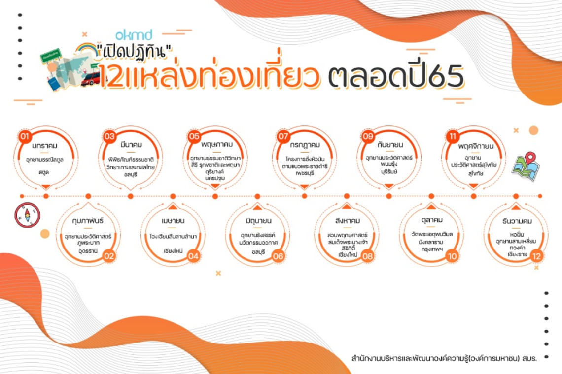 สำนักงานบริหารและพัฒนาองค์ความรู้ (องค์การมหาชน) : สบร. หรือ OKMD (Office of Knowledge Management and Development: Public Organization) OKMD ร่วมเชิญชวนคนไทยท่องเที่ยวไปด้วย เรียนรู้ไปด้วย ตลอดปี กับ 12 สุดยอดแหล่งเรียนรู้สร้างสรรค์ประจำปี หลังจากทุกภาคธุรกิจหยุดชะงักจากสถานการณ์โควิด-19 ตลอดปี 2565 เชื่อมั่นการท่องเที่ยวยังคงเป็นรายได้หลักที่จะขับเคลื่อนเศรษฐกิจประเทศ และยกคุณภาพชีวิตคนไทยให้ดียิ่งขึ้น เหตุยังมีแหล่งท่องเที่ยวเรียนรู้ที่น่าสนใจและค้นหาทั่วไทยอีกมาก!