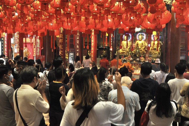 วันที่ 2 ม.ค.65 ผู้สื่อข่าวรายงาน ว่า ชาวไทยเชื้อสายจีนจำนวนมาก มาไหว้เจ้าแก้ปีชงต่อองค์ไท้ส่วยเอี้ย หรือ เทพเจ้าผู้คุ้มครองดวงชะตา ในช่วงวันขึ้นปีใหม่ พุทธศักราช ๒๕๖๕ โดยในปีนี้ปีชง คือ ปีวอก ส่วนปีชงร่วมคือ ปีนักษัตร ขาล, กุน และมะเส็ง นอกจากแก้ปีชงแล้วยังไหว้เจ้าเพื่อความสิริมงคลแก่ตัวเองและครอบครัวให้มีความสุข ความเจริญ ปลอดโรค ปลอดภัย ที่วัดมังกรกมลาวาส (วัดเล่งเน่ยยี่) ถ.เจริญกรุง