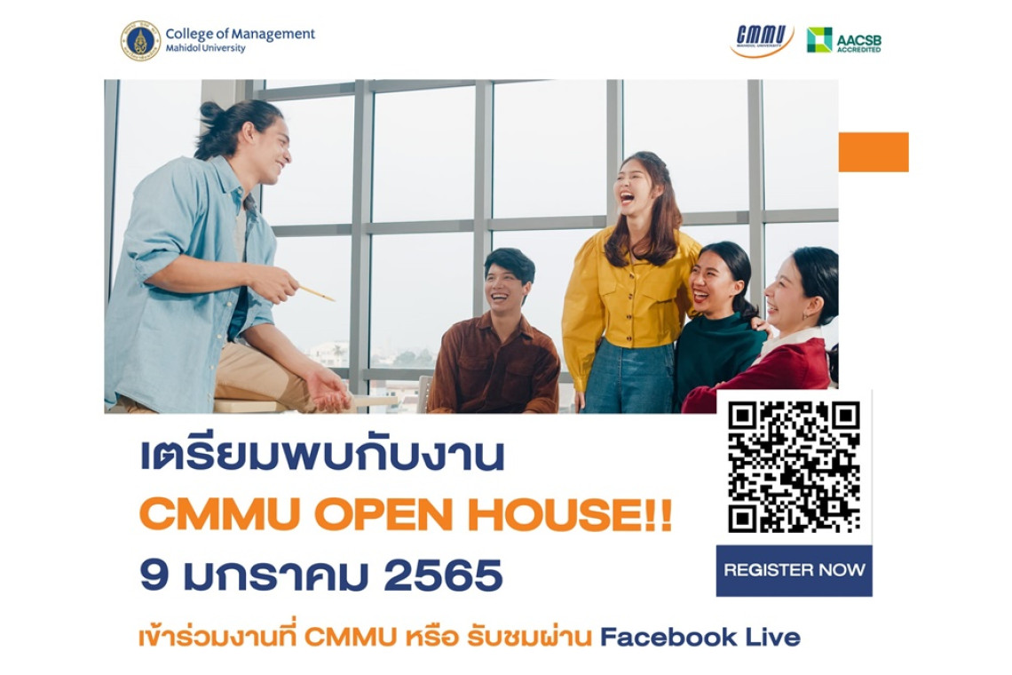 วิทยาลัยการจัดการ มหาวิทยาลัยมหิดล หรือ ซีเอ็มเอ็มยู (CMMU) เปิดบ้านการเรียนรู้ Open House รูปแบบ Hybrid Event ชวนผู้วางแผนศึกษาต่อ ป.โท ด้านการจัดการหลักสูตรไทยและหลักสูตรนานาชาติ ร่วมสร้างเส้นทางการเป็น MVP หรือผู้เล่นตัวจริงในโลกธุรกิจ และขยายโอกาสทางการทำงานในองค์กรชั้นนำทั่วโลก พบกับคำแนะนำในการเลือกเรียนต่อจากคณาจารย์ทั้งชาวไทยและชาวต่างชาติอย่างเต็มรูปแบบ ที่จะพาเรียนรู้เกี่ยวกับหลักสูตร เจาะลึกทุกสาขาวิชา พร้อมไฮไลท์หลักสูตร Double Degree เรียนจบได้ปริญญา 2 ใบที่ประเทศฝรั่งเศสและออสเตรเลีย สู่เส้นทางการทำงานต่อที่ต่างประเทศ พร้อมสัมผัสบรรยากาศการเรียนโดยเปิดห้อง Demo class ให้ทดลองเรียนจริง! ในวันอาทิตย์ที่ 9 มกราคม 2565 เวลา 09.30 – 15.30 น. ทั้งนี้สามารถรับชมงานเปิดบ้านสด ผ่านเพจเฟซบุ๊ก CMMU Mahidol หรือเข้างานสำรวจสถานที่เรียนจริงได้ ณ วิทยาลัยการจัดการ มหาวิทยาลัยมหิดล ถนนวิภาวดีรังสิต โดยจำกัดจำนวน 50 ที่นั่ง! ลงทะเบียนร่วมงานที่ https://admission.cm.mahidol.ac.th/onlineadmission/link/op/ พร้อมทั้งรับส่วนลดค่าสมัคร สำหรับผู้ที่สมัครเรียนภายในวันเปิดบ้านนี้เท่านั้น!