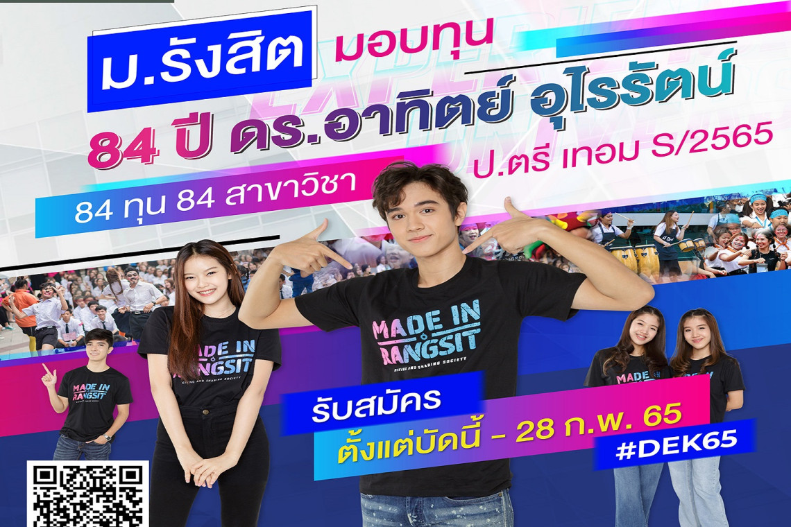 มหาวิทยาลัยรังสิต มอบทุนการศึกษา “84 ปี ดร.อาทิตย์ อุไรรัตน์” จำนวน 84 ทุน สำหรับ 84 สาขาวิชา ซึ่งเป็นทุนการศึกษาเพื่อช่วยเหลือและให้โอกาสแก่นักเรียนที่มีความประสงค์จะศึกษาต่อระดับปริญญาตรี ของมหาวิทยาลัยรังสิต โดยผู้ที่ได้รับทุนการศึกษาจะได้รับการยกเว้น ค่าหน่วยกิต และค่าบำรุงการศึกษาตลอดหลักสูตรในระดับปริญญาตรี คุณสมบัติของผู้ขอรับทุนการศึกษามีดังนี้ 1. เป็นผู้ที่กำลังศึกษาอยู่ระดับชั้นมัธยมศึกษาปีที่ 6 หรือเทียบเท่า และจะต้องสำเร็จการศึกษาระดับมัธยมศึกษาปีที่ 6 หรือเทียบเท่าเมื่อถึงกำหนดเปิดภาคการศึกษาที่ 1 ประจำปีการศึกษา 2565 2. มีความมุ่งมั่นและมีศักยภาพในการศึกษาได้ในหลักสูตรที่ประสงค์จะเข้าศึกษาต่อ 3. เป็นผู้มีความประพฤติดี