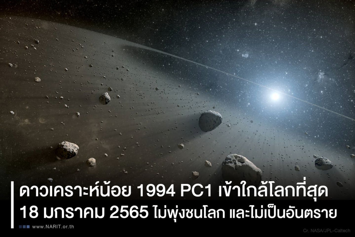 เพจ NARIT สถาบันวิจัยดาราศาสตร์แห่งชาติ โพสต์ผ่านเฟซบุ๊กระบุ "1994 PC1 ดาวเคราะห์น้อยขนาด 1 กิโลเมตร เข้าใกล้โลกที่สุด 18 มกราคมนี้ #เพียงผ่านมาใกล้ #ไม่พุ่งชน และ #ไม่เป็นอันตรายต่อโลก
