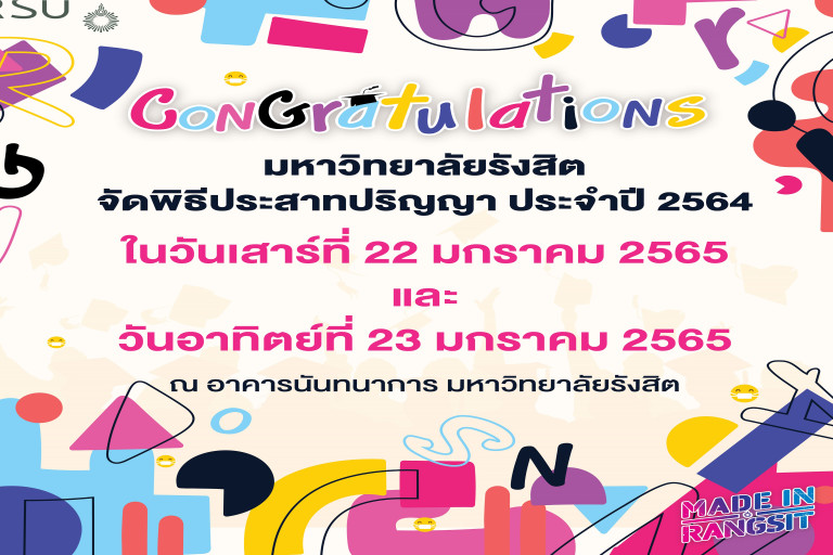 มหาวิทยาลัยรังสิต จัดพิธีประสาทปริญญา ประจำปี 2564 ในวันเสาร์ที่ 22 ม.ค.65 (ฝึกซ้อม) และวันอาทิตย์ที่ 23 ม.ค.65 ณ อาคารนันทนาการ มหาวิทยาลัยรังสิต โดยได้รับเกียรติจาก ศาสตราจารย์เกียรติคุณ ดร.พรชัย มาตังคสมบัติ เป็นประธาน