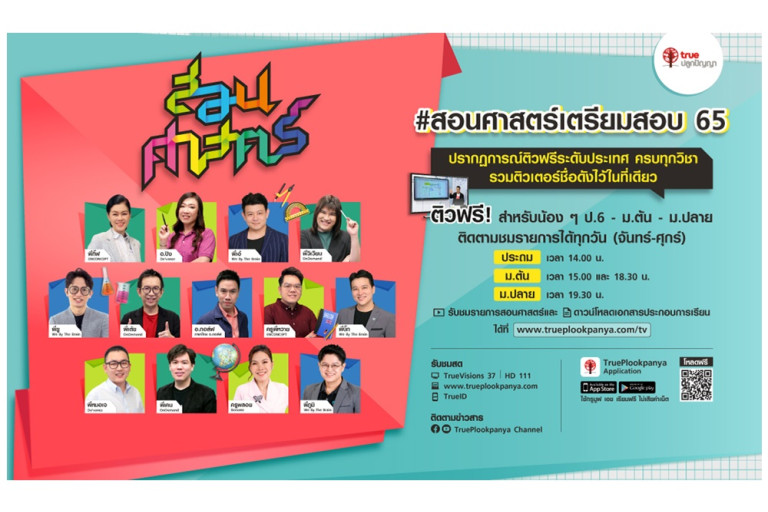ทรูปลูกปัญญา สร้างปรากฏการณ์ดึงติวเตอร์ชั้นนำของประเทศ อัดแน่นเต็มพิกัดในรายการ #สอนศาสตร์เตรียมสอบ 65 ให้น้องๆ ตั้งแต่ชั้นประถมศึกษาปีที่ 6 มัธยมต้น ถึงมัธยมปลายทั่วประเทศ ได้อัปเดตทุกเทรนด์ความรู้ สนุกครบทุกวิชา โดยเหล่าติวเตอร์จากหลากหลายสถาบันกวดวิชาแนวหน้าของไทย อาทิ พี่เอ๋–วิเศษ กี่สุขพันธ์ จากสถาบัน WE by The Brain พี่วิเวียน–นพ.วีรวัช เอนกจำนงค์พร จากสถาบัน OnDemand อ.ปิง–ปิง เจริญศิริวัฒน์ จากสถาบัน DA’VANCE อ.กอล์ฟ–วรธน อนันตวงษ์ จากสถาบันภาษาไทย อ.กอล์ฟ พี่กิ๊ฟ–วลีรัตน์ หาญเมธีคุณา จากสถาบัน ENCONCEPT ครูพลอย–พัชรา ลิมป์วรรณธะ จากสถาบัน Berante เช็คคลาสเรียน พร้อมรับความรู้และเทคนิคดีๆ เอาไปสอบได้แบบเป๊ะปัง ติวดี ติวฟรี ทุกวันจันทร์ – ศุกร์ ชั้น ป.6 เวลา 14.00 น. ม.ต้น เวลา 15.00 น. และ 18.30 น. และ ม.ปลาย เวลา 19.30 น. ครบสุด 3 แพลตฟอร์ม ทั้งช่องทรูปลูกปัญญา ช่องความรู้ ดูสนุก ทรูวิชั่นส์ 37 และ HD 111 เว็บไซต์ www.trueplookpanya.com และแอปพลิเคชันทรูไอดี โดยสามารถดาวน์โหลดเอกสารประกอบการติวได้ที่ www.trueplookpanya.com/tv นอกจากนี้ ยังสามารถรับชมย้อนหลังได้ที่แอปพลิเคชันทรูไอดี : สอนศาสตร์ โดย ทรูปลูกปัญญา และ YouTube : TruePlookpanya Channel