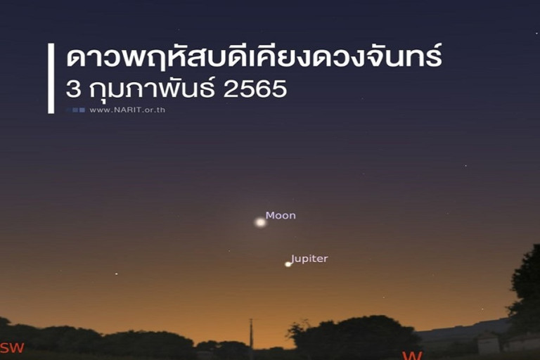 เพจ NARIT สถาบันวิจัยดาราศาสตร์แห่งชาติ โพสต์ผ่านเฟซบุ๊กระบุ "3 กุมภาพันธ์ 2565 ดาวพฤหัสบดีเคียงดวงจันทร์ สังเกตได้ทางทิศตะวันตก หลังดวงอาทิตย์ลับขอบฟ้าจนถึงเวลาประมาณ 19:50 น.