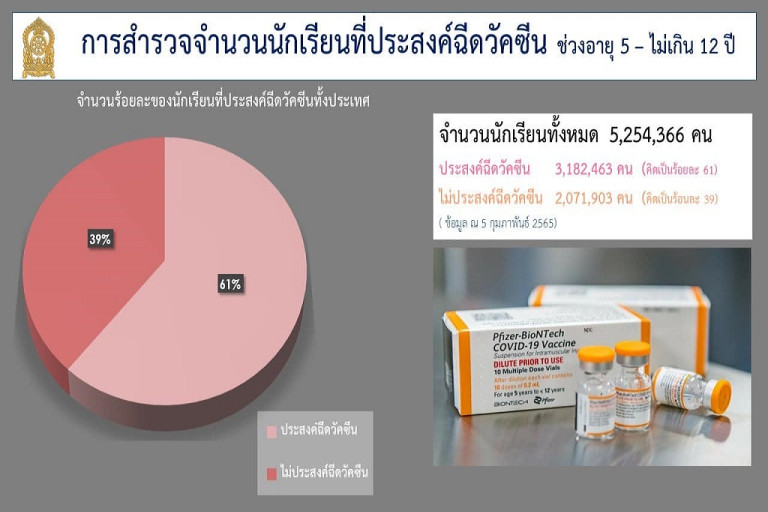 ข้อมูลกระทรวงศึกษาธิการ รายงานจำนวนนักเรียนที่ประสงค์ฉีดวัคซีน ช่วงอายุ 5 - ไม่เกิน 12 ปี จากจำนวนทั้งหมด 5,254,366 คน ประสงค์ฉีด 3.18 ล้านคน คิดเป็น 61% ไม่ประสงค์ฉีด 2.07 ล้านคน คิดเป็น 39%