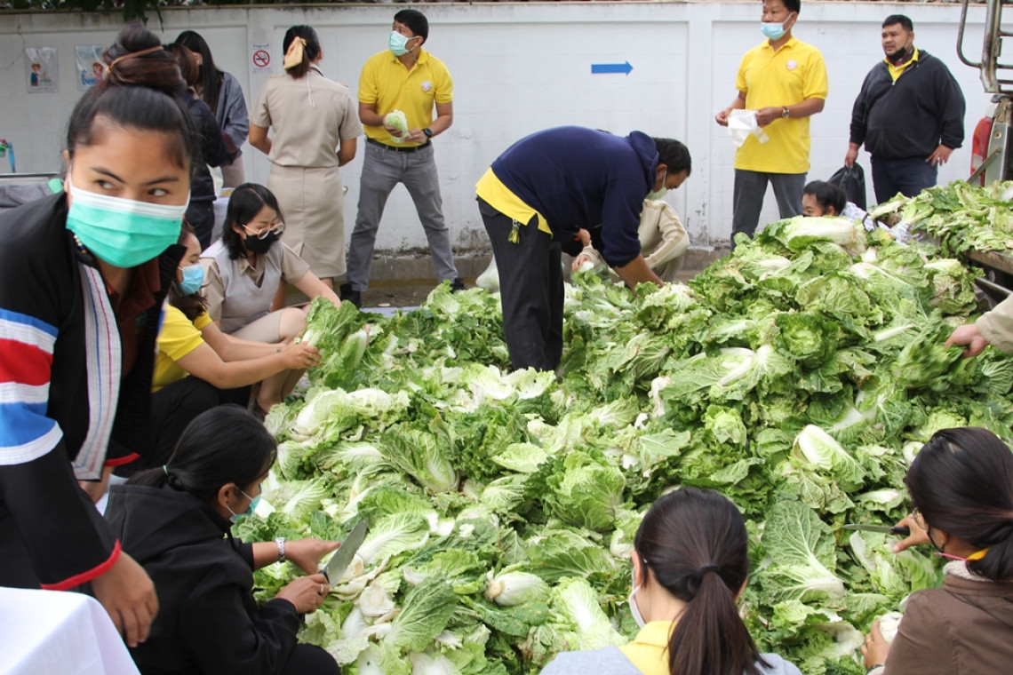 วันที่ 7 ก.พ.65 นายเชษฐา โมสิกรัตน์ ผวจ.แม่ฮ่องสอน พร้อมด้วย นางสาวยุพา นาคา พาณิชย์จังหวัดแม่ฮ่องสอน พร้อมด้วยหัวหน้าส่วนราชการได้ร่วมกันแจกจ่ายผักกาดขาวจำนวน 3,000 กิโลกรัมให้แก่ประชาชนชาวแม่ฮ่องสอน ได้นำไปรับประทานกันฟรี คนละ 5–10 กิโลกรัม บริเวณหน้าสำนักงานพาณิชย์จังหวัดแม่ฮ่องสอน หลังทางจังหวัดแม่ฮ่องสอนได้มอบให้สำนักงานพาณิชย์จังหวัดแม่ฮ่องสอนสั่งซื้อผักกาดขาวกับเกษตรกรชาวแม่ฮ่องสอนในราคากิโลกรัมละ 3 บาทเพื่อเป็นการช่วยเหลือ หลังผลผลิตล้นตลาด ราคาตกต่ำ เนื่องจากหลายจังหวัดมีการขยายพื้นที่ปลูกผลผลิตออกมาพร้อมกัน ประกอบกับมีผักกาดขาวจากประเทศจีนทะลักเข้ามากับขบวนรถไฟจากจีนเทียบท่าที่ลาว และกระจายมายังตลาดหลายแห่งในประเทศไทย ทำให้เกษตรกรชาวม้งในจังหวัดแม่ฮ่องสอนได้รับผลกระทบ ไม่มีตลาดรับซื้อ และสามารถจำหน่ายผักกาดขาวได้เพียงกิโลกรัมละ 1 บาทซึ่งต่ำกว่าต้นทุนการผลิต ทำให้เกษตรกรบางรายเกิดความเครียดถึงกับปล่อยผักกาดขาวเน่าเสียคาไร่และตัดทำลายทิ้งนับ 100 ไร่