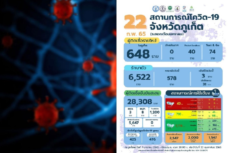 ผู้สื่อข่าวรายงานว่า สำนักงานสาธารณสุขจังหวัดภูเก็ต เปิดเผยสถานการณ์โควิด-19 ระลอกเดือนมกราคม ประจำวันที่ 22 กุมภาพันธ์2565 ผู้ติดเชื้อรายใหม่ในภูเก็ต648ราย Phuket sandbox 40ราย และTest & Go 74ราย โดยขณะนี้มีผู้รักษาตัว 6,522ราย ขณะยอดผู้เสียชีวิตเพิ่มอีก3ราย เสียชีวิตสะสม31ราย และทำให้จำนวนเตียงรองรับผู้ป่วยเหลือว่าง1,547 เตียงหรือ43.61%ของเตียงทั้งหมด3547เตียง