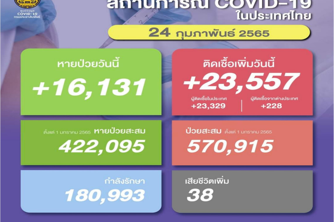 วันที่ 24 ก.พ.2565 ศูนย์ข้อมูล COVID-19 รายงานยอดผู้ติดเชื้อโควิด-19 รายใหม่จำนวน 23,557 ราย จำแนกเป็น ติดเชื้อในประเทศ 23,329 ราย ติดเชื้อจากต่างประเทศ 228 ราย ทำให้ยอดผู้ป่วยสะสมตั้งแต่ 1 มกราคม 2565 มีจำนวน 570,915 ราย หายป่วยกลับบ้าน 16,131 ราย เสียชีวิต 38 ราย รวมเสียชีวิตสะสมตั้งแต่ ปี 2563-ปัจจุบัน จำนวน 22,768 ราย
