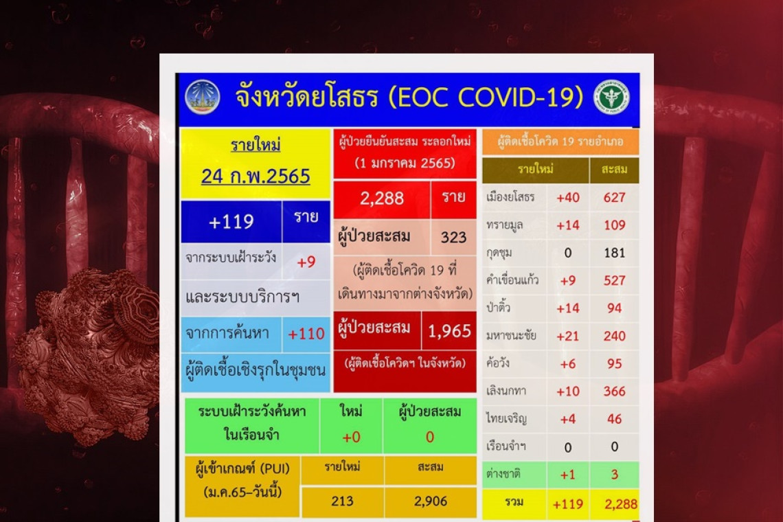 วันที่ 24 กุมภาพันธ์ 2565 ผู้สื่อข่าวรายงานว่า จังหวัดยโสธรพบผู้ป่วยที่ติดเชื้อไวรัสโควิด-19 เพิ่มมากสุดตั้งแต่เกิดการระบาดของเชื้อไวรัสโควิด-19 พบเพิ่ม 119 ราย โดยอำเภอเมืองยโสธร 627 ราย อำเภอทรายมูล 109 ราย อำเภอกุดชุม 181ราย อำเภอคำเขื่อนแก้ว 527 ราย อำเภอมหาชนะชัย 240 ราย อำเภอค้อวัง 95 ราย อำเภอเลิงนกทา 366 ราย อำเภอไทยเจริญ 46 ราย อำเภอป่าติ้ว 94 รายส่วนผู้ป่วยโควิด-19 ของจังหวัดยโสธรตั้งแต่วันที่ 1 มกราคม 2565 สะสมจำนวน 2,288 ราย รักษาหายสะสม 1,583 ราย และยังไม่มีผู้เสียชีวิตแต่อย่างใด