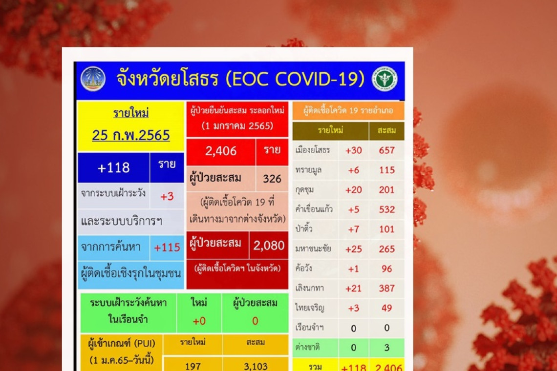 วันที่ 25 กุมภาพันธ์ 2565 ผู้สื่อข่าวรายงานว่าจังหวัดยโสธรพบผู้ป่วยที่ติดเชื้อไวรัสโควิด-19 เพิ่มต่อเนื่องพบเพิ่มอีก 118 ราย โดยอำเภอเมืองยโสธร 657 ราย อำเภอทรายมูล 115 ราย อำเภอกุดชุม 201ราย อำเภอคำเขื่อนแก้ว 535 ราย อำเภอมหาชนะชัย 265 ราย อำเภอค้อวัง 96 ราย อำเภอเลิงนกทา 387 ราย อำเภอไทยเจริญ 49 ราย อำเภอป่าติ้ว 101 รายส่วนผู้ป่วยโควิด-19 ของจังหวัดยโสธรตั้งแต่วันที่ 1 มกราคม 2565 สะสมจำนวน 2,406 ราย รักษาหายสะสม 1,638 ราย เสียชีวิต 1 ราย