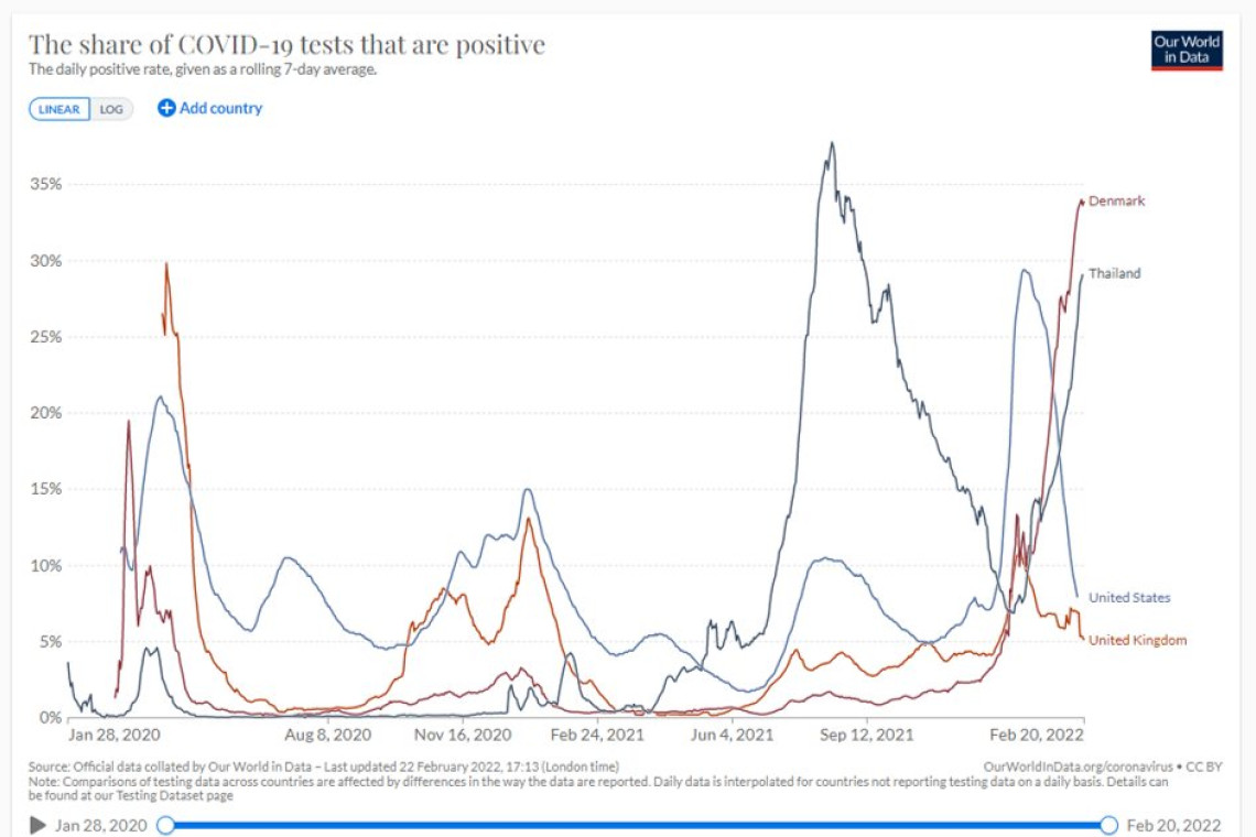 ในกราฟนี้เดนมาร์กเป็นประเทศที่น่าสนใจเพราะโดนโอมิครอนเข้าระบาดในเวลาใกล้เคียงกับ UK แต่ UK สามารถหักหัวกราฟลงได้ไว ทั้งๆ ที่ 2 ประเทศนี้ลดระดับมาตรการการป้องกันทั้งคู่ ส่วน USA ก็หักได้ไวเช่นเดียวกันแม้จะใช้เวลานานกว่า UK ... อีกสาเหตุหนึ่งคือ เดนมาร์กมีการแพร่กระจายของ BA.2 เป็นสายพันธุ์หลัก ขณะที่ UK และ USA ยังเป็น BA.1 ซึ่งเป็นสายพันธุ์หลักอยู่ ความแตกต่างนี้น่าจะมีส่วนอธิบายได้เช่นกัน