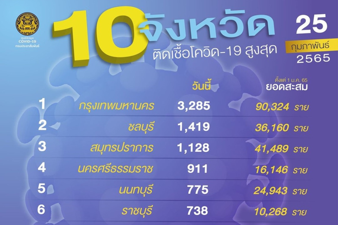 ศูนย์ข้อมูลโควิด-19 รายงานสถานการณ์โรคติดเชื้อไวรัสโควิด-19 ข้อมูล ณ วันที่ 25 ก.พ.65 เวลา 01.00 น. พบว่าสถานการณ์โรคติดเชื้อโควิดของไทยเพิ่มสูงขึ้น โดยยังคงพบผู้ติดเชื้อรายใหม่ในทุกจังหวัด ซึ่งใน 10 อันดับจังหวัดติดเชื้อสูงสุด พบผู้ติดเชื้อใหม่ล้วนเพิ่มขึ้น มียกเว้นเพียง 2 จังหวัดคือ อันดับ 5 นนทบุรี ที่ลดลงจากเมื่อวานที่ 775 ราย (จาก 875 ราย) และอันดับ 7 สมุทรสาคร 716 ราย (จาก 790 ราย)