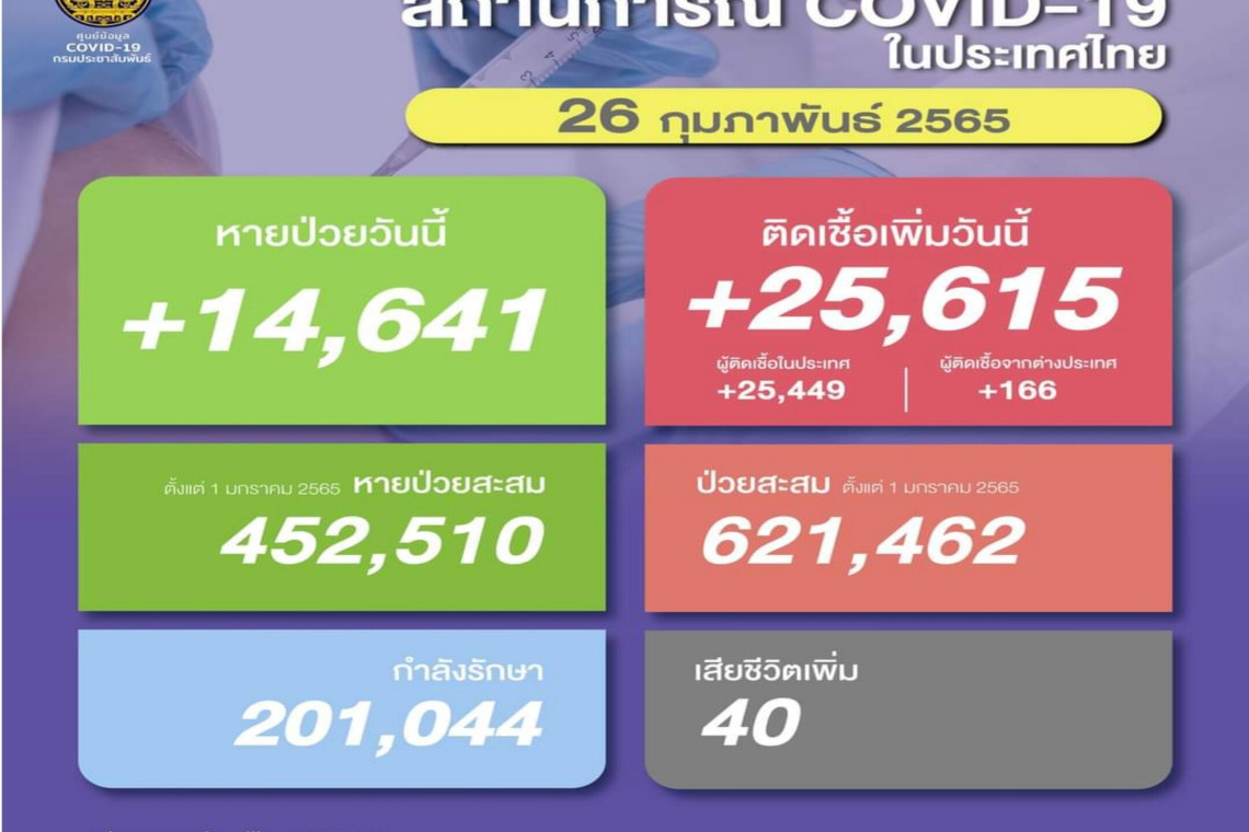วันที่ 26 ก.พ.2565 ศูนย์ข้อมูล COVID-19 รายงานยอดผู้ติดเชื้อโควิด-19 รายใหม่จำนวน 25,615 ราย จำแนกเป็น ติดเชื้อในประเทศ 25,449 ราย ติดเชื้อจากต่างประเทศ 166 ราย ทำให้ยอดผู้ป่วยสะสมตั้งแต่ 1 มกราคม 2565 มีจำนวน 621,462 ราย หายป่วยกลับบ้าน 14,641 ราย เสียชีวิต 40 ราย รวมเสียชีวิตสะสมตั้งแต่ ปี 2563-ปัจจุบัน จำนวน 22,849 ราย