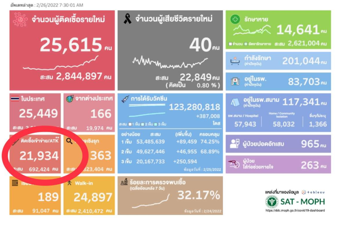 ข้อมูลกรมควบคุมโรค กระทรวงสาธารณสุข รายงานวันที่ 26 ก.พ.65 พบผู้ติดเชื้อรายใหม่ 25,615 ราย โดยพบผลตรวจ ATK ลดลงจากเมื่อวาน 21,934 ราย รวมผลตรวจ ATK สะสมจำนวน 692,424 ราย โดยเมื่อรวมผลตรวจ ATK เท่ากับวันนี้มีผู้ติดเชื้อเพิ่มอย่างไม่เป็นทางการถึง 47,549 ราย