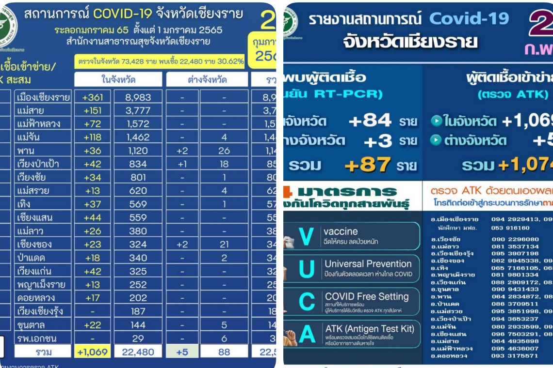 ทั้งนี้ พบผู้ติดเชื้อเข้าข่าย ตรวจ ATK รวม 1,074 ราย ในจังหวัด 1,069 ราย (3 อันดับสูงสุด อ.เมืองเชียงราย 361 ราย อ.แม่สาย 151 ราย อ.แม่จัน 118 ราย) และติดเชื้อจาดต่างจังหวัด 5 ราย