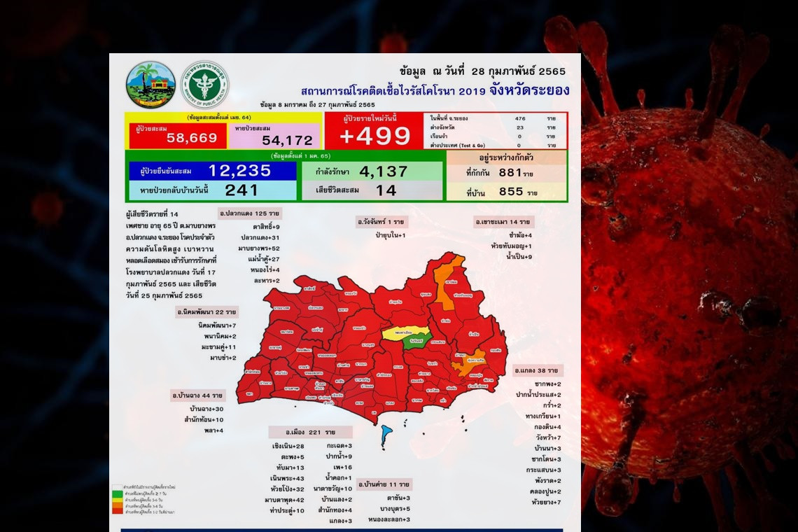 เมื่อวันที่ 28 ก.พ.65 ศูนย์ปฏิบัติการฯ โควิด-19 ระยอง รายงานสถานการณ์การแพร่ระบาดโควิด-19 ของจังหวัดระยองว่า วันนี้พบผู้ติดเชื้อโควิดเสียชีวิต 1 ราย เป็นเพศชาย อายุ 65 ปี ชาว ต.มาบยางพร อ.ปลวกแดง มีโรคประจำตัวความดันโลหิตสูง เบาหวาน หลอดเลือดสมอง เข้ารักษาตัว รพ.ปลวกแดง วันที่ 17 ก.พ.เสียชีวิตวันที่ 25 ก.พ.ทำให้มียอดผู้ติดเชื้อเสียชีวิตสะสมระลอกใหม่เพิ่มเป็น 14 ราย ส่วนผู้ติดเชื้อรายวันพบเพิ่ม 499 ราย ผู้ติดเชื้อสะสมละลอกใหม่เพิ่มเป็น 58,669 ราย หายป่วยแล้ว 54,172 ราย โดยพบผู้ติดเชื้อทั้ง 8 อำเภอ โดยพบสูงสุดอยู่ใน อ.เมืองระยอง 221 ราย รองลงมามี อ.ปลวกแดง 125 ราย อ.บ้านฉาง 44 ราย อ.แกลง 38 ราย อ.นิคมพัฒนา 22 ราย อ.เขาชะเมา 14 ราย อ.บ้านค่าย 11 ราย อ.วังจันทร์ 1 ราย ต่างจังหวัดเข้ามารักษาตัว 23 ราย มียอดฉีดวัคซีน 1,915,558 เข็ม มียอดจองวัคซีน 574,970 คน.
