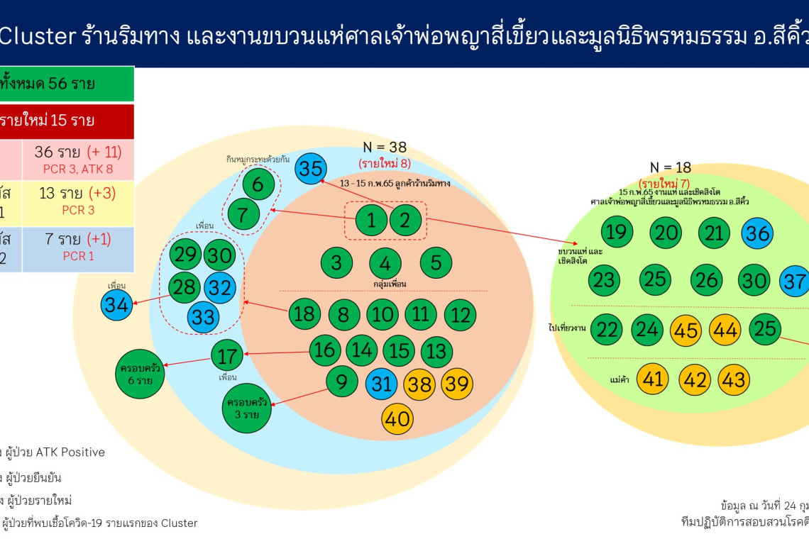 ศูนย์บัญชาเหตุการณ์ตอบโต้โรคติดเชื้อไวรัสโควิด-19 จ.นครราชสีมา ชี้แจงควาใมคืบหน้าการเฝ้าระวังและควบคุมการแพร่ระบาดของคลัสเตอร์ดังกล่าว พบผู้ป่วย 2 ราย อยู่ในคณะเชิดสิงโตที่ต้องมาร่วมขบวนแห่ศาลเจ้าพญาสี่เขี้ยวในวันที่ 15 ก.พ ต่อมา ศปก.อ.สีคิ้ว ค้นหาผู้ป่วย สอบสวนโรคพบพฤติกรรมรับประทานอาหารร่วมกับเพื่อนในคณะเชิดสิงโตที่ร้านอาหารริมทาง ผลตรวจ ATK พบผู้ติดเชื้อในขบวนแห่ ร้านริมทางซึ่งเป็นกลุ่มเพื่อนและคนในครอบครัวรวมทั้งลูกค้าที่มาใช้บริการรวมจากนั้นเชื้อได้ขยายวงลุกลามทำให้แม่ค้า ผู้มาเที่ยวงานและแพร่เชื้อให้ครอบครัว รวมป่วยสะสม 56 ราย