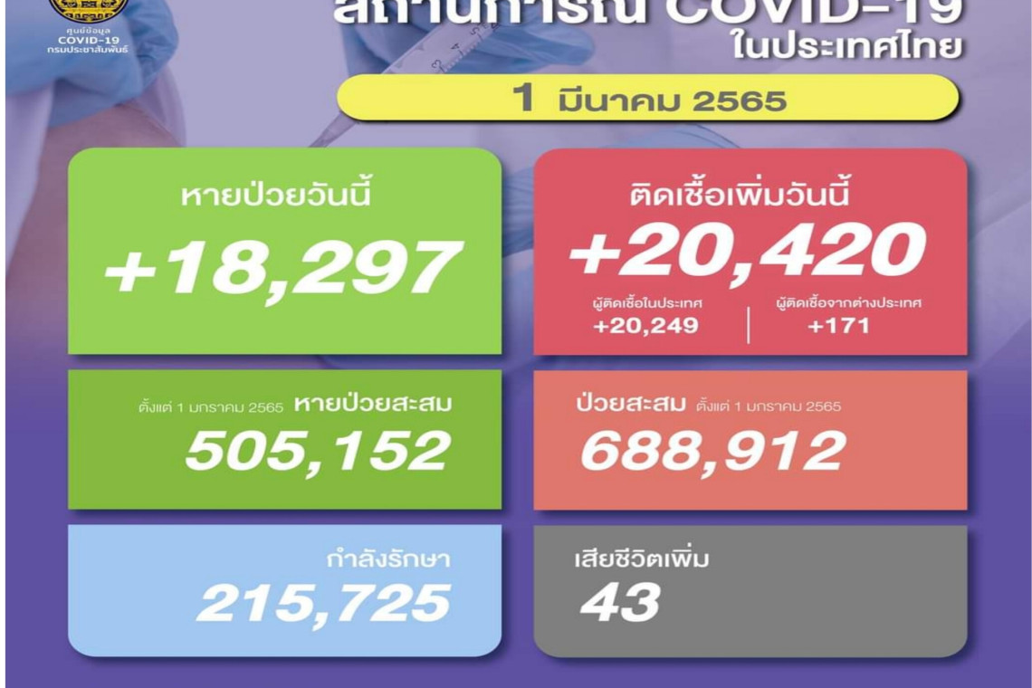 วันที่ 1 มี.ค.2565 ศูนย์ข้อมูล COVID-19 รายงานยอดผู้ติดเชื้อโควิด-19 รายใหม่จำนวน 20,420 ราย จำแนกเป็น ติดเชื้อในประเทศ 20,249 ราย ติดเชื้อจากต่างประเทศ 171 ราย ทำให้ยอดผู้ป่วยสะสมตั้งแต่ 1 มกราคม 2565 มีจำนวน 688,912 ราย หายป่วยกลับบ้าน 18,297 ราย เสียชีวิต 43 ราย รวมเสียชีวิตสะสมตั้งแต่ ปี 2563-ปัจจุบัน จำนวน 22,976 ราย