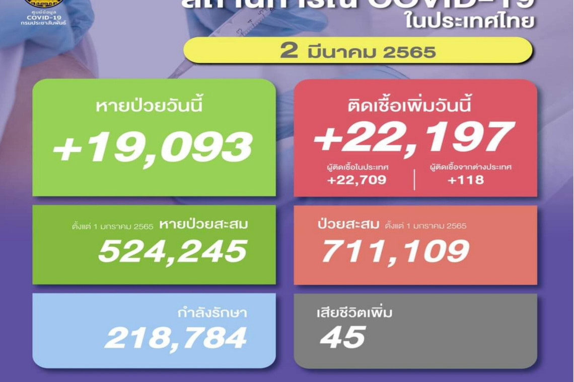 วันที่ 2 มี.ค.2565 ศูนย์ข้อมูล COVID-19 รายงานยอดผู้ติดเชื้อโควิด-19 รายใหม่จำนวน 22,197 ราย จำแนกเป็น ติดเชื้อในประเทศ 22,709 ราย ติดเชื้อจากต่างประเทศ 118 ราย ทำให้ยอดผู้ป่วยสะสมตั้งแต่ 1 มกราคม 2565 มีจำนวน 711,109 ราย หายป่วยกลับบ้าน 19,093 ราย เสียชีวิต 45 ราย รวมเสียชีวิตสะสมตั้งแต่ ปี 2563-ปัจจุบัน จำนวน 23,021 ราย