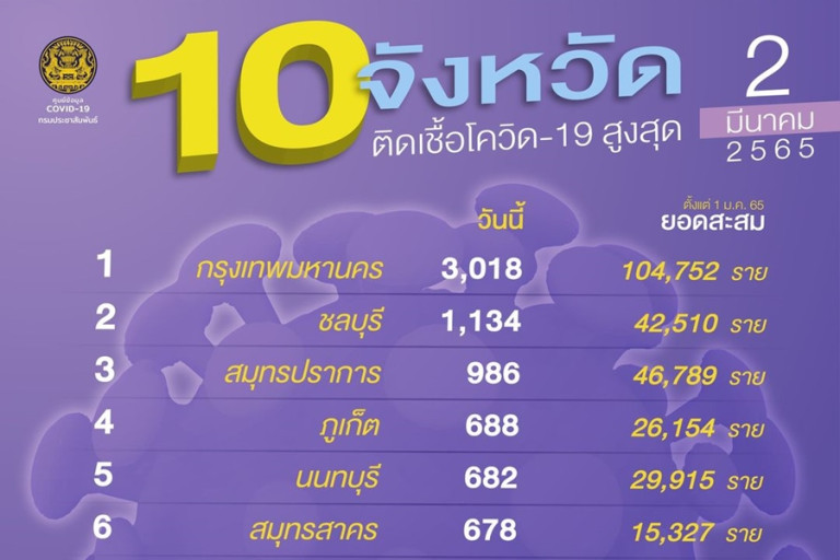 ศูนย์ข้อมูลโควิด-19 รายงานสถานการณ์โรคติดเชื้อไวรัสโควิด-19 ข้อมูล ณ วันที่ 2 มี.ค.65 เวลา 01.00 น. พบว่าประเทศไทยยังคงพบผู้ติดเชื้อรายใหม่ในทั้ง 77 จังหวัด โดยวันนี้ 10 อันดับจังหวัดติดเชื้อสูงสุด พบวันนี้มี 2 จังหวัดที่ตัวเลขติดเชื้อใหม่อยู่ในหลักพัน คือ อันดับ 1 กทม.ที่ตัวเลขติดเชื้อใหม่เพิ่มขึ้นอยู่ที่ 3,018 ราย (จาก 2,752 ราย) อันดับ 2 วันนี้ชลบุรี ขยับขึ้นมาจากอันดับ 3 แต่ลดลงจากเมื่อวาน ทั้งนี้ พบว่าอันดับ 4 ภูเก็ต อันดับ 6 สมุทรสาคร อันดับ 8 นครราชสีมา อันดับ 9 ราชบุรี และอันดับ 10 บุรีรัมย์ ตัวเลขติดเชื้อใหม่เพิ่มขึ้นจากเมื่อวาน ส่วนจังหวัดที่พบผู้ติดเชื้อรายใหม่น้อยที่สุดคือ ลำพูน 6 ราย
