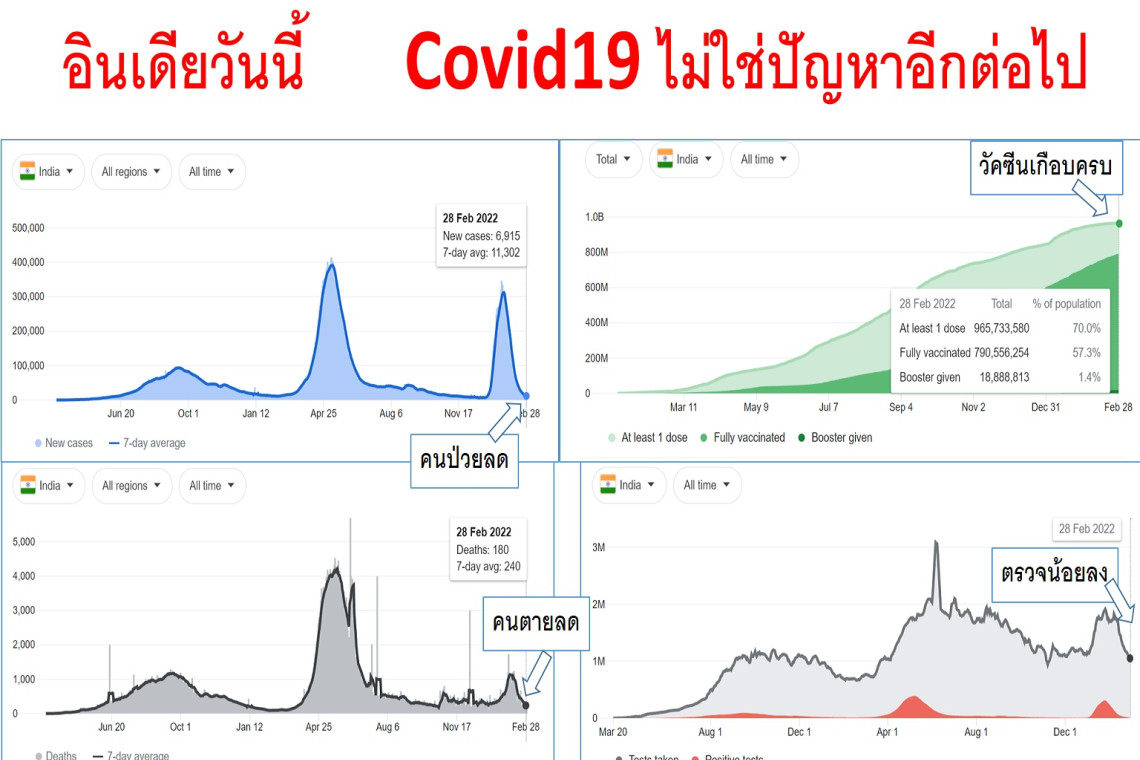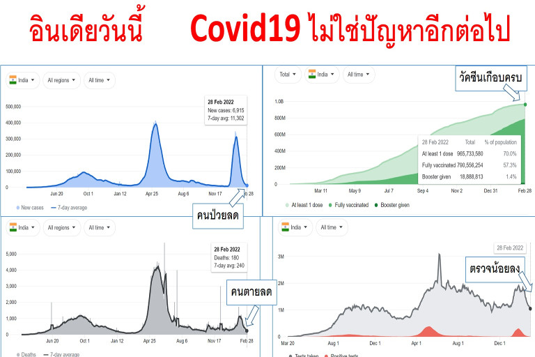 -สถานการณ์ในไทย ก็ไม่ต่างจากอินเดีย เรามีคนฉีดวัคซีนแล้วมากกว่าอินเดียเสียด้วยซ้ำ อัตราตายก็ต่ำกว่าอินเดียมาก ... สิ่งเดียวที่เรายังไม่ได้ทำคือ ยังไล่ตรวจเชื้อคนทุกคน ATK ทุกสัปดาห์ บางคนทุกวัน ทั้งที่ไม่มีอาการ ขณะที่อินเดียหยุดแล้ว... ทั้งนี้ ไม่รู้ว่ามีเหตุผลอื่นๆไหม ที่ทำให้ยังเป็นแบบนี้อยู่ เหตุผลด้านประกัน ด้านดราม่าในสังคม