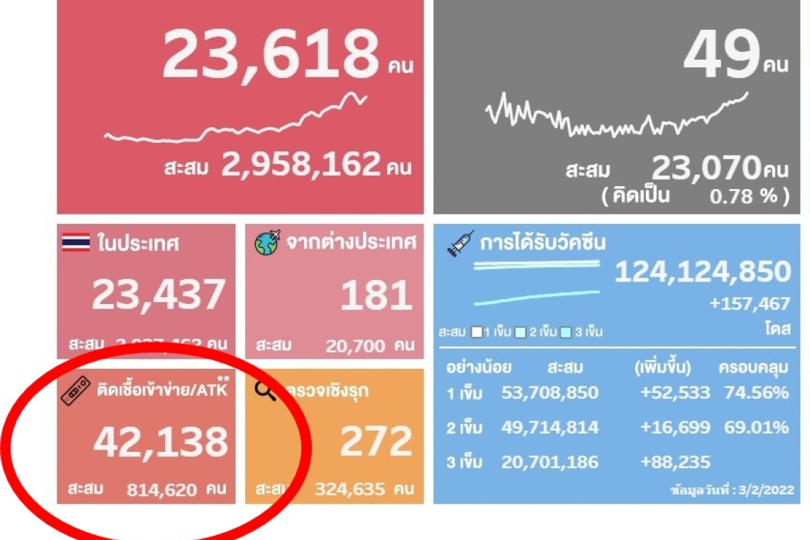 กรมควบคุมโรค กระทรวงสาธารณสุข รายงานผลการตรวจ ATK ข้อมูล ณ วันที่ 3 มี.ค.65 เวลา 07.22 น. พบผลตรวจ ATK เป็นบวกเพิ่มขึ้นสูงสุดเป็นประวัติการณ์เท่าที่เคยมีการรายงานมาคือ 42,138 ราย ขณะที่จำนวนผู้ติดเชื้อรายใหม่อยู่ที่ 23,618 ราย ทำให้ยอดผู้ติดเชื้อรายใหม่อย่างไม่เป็นทางการทำสถิติสูงสุดอยู่ที่ 65,756 ราย วันนี้จึงเรียกว่าทุบสถิติทั้งผลตรวจ ATK และจำนวนผู้เสียชีวิต 49 รายที่สูงสุดในรอบปีนี้