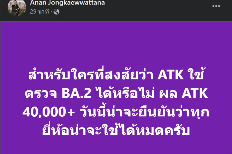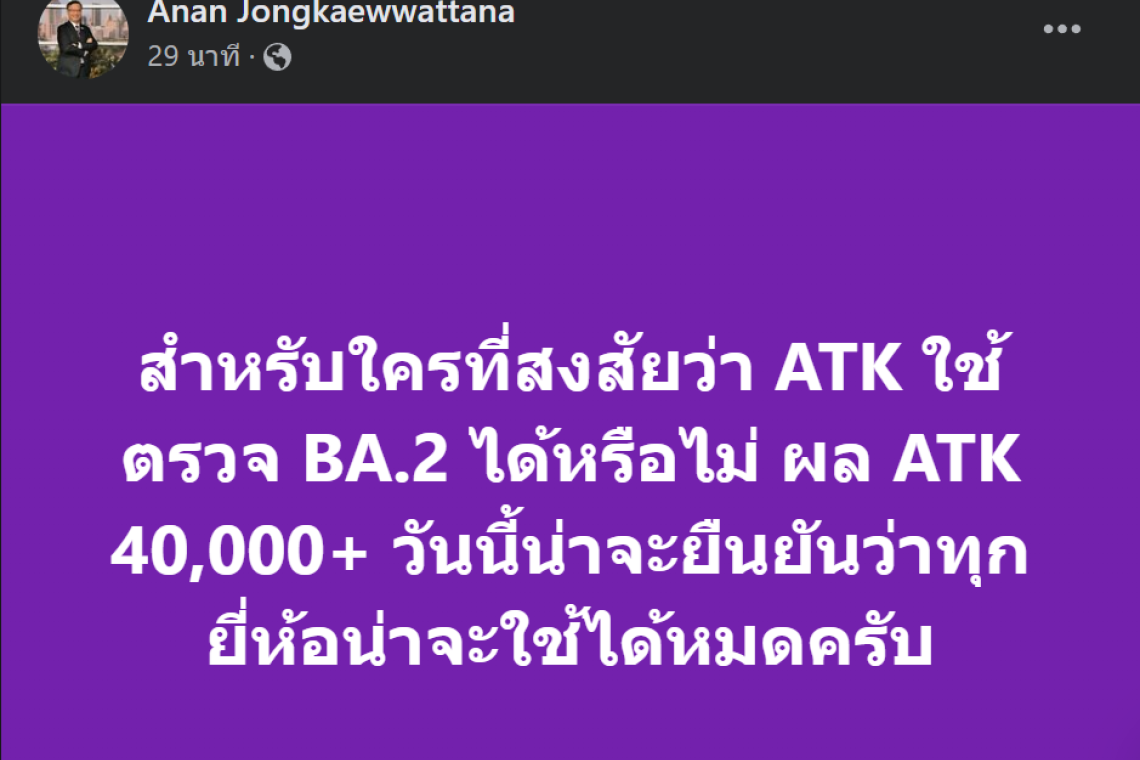 เมื่อวันที่ 3 มี.ค.65 ดร.อนันต์ จงแก้ววัฒนา นักไวรัสวิทยา ผู้อำนวยการกลุ่มวิจัยนวัตกรรมสุขภาพสัตว์และการจัดการ ศูนย์พันธุวิศวกรรมและเทคโนโลยีชีวภาพแห่งชาติ(ไบโอเทค) สำนักงานพัฒนาวิทยาศาสตร์และเทคโนโลยีแห่งชาติ (สวทช.) โพสต์ข้อความผ่านเฟซบุ๊กโดยระบุ "สำหรับใครที่สงสัยว่า ATK ใช้ตรวจ BA.2 ได้หรือไม่ ผล ATK 40,000+ วันนี้น่าจะยืนยันว่าทุกยี่ห้อน่าจะใช้ได้หมดครับ"