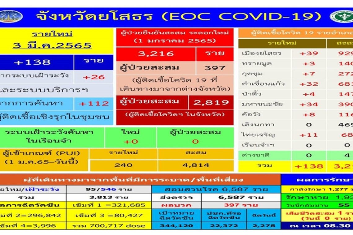วันที่ 3 มี.ค.65 ผู้สื่อข่าวรายงานว่า จังหวัดยโสธรพบผู้ป่วยที่ติดเชื้อไวรัสโควิด-19 เพิ่มต่อเนื่องพบเพิ่มอีก 138 ราย โดยอำเภอเมืองยโสธร 929 ราย อำเภอทรายมูล 140 ราย อำเภอกุดชุม 272 ราย อำเภอคำเขื่อนแก้ว 681 ราย อำเภอมหาชนะชัย 390 ราย อำเภอค้อวัง 116 ราย อำเภอเลิงนกทา 469 ราย อำเภอไทยเจริญ 68 ราย อำเภอป่าติ้ว 147 รายส่วนผู้ป่วยโควิด-19 ของจังหวัดยโสธรตั้งแต่วันที่ 1 มกราคม 2565 ป่วยสะสมจำนวน 3,216 ราย รักษาหายสะสม 1,939 ราย เสียชีวิต 1 ราย