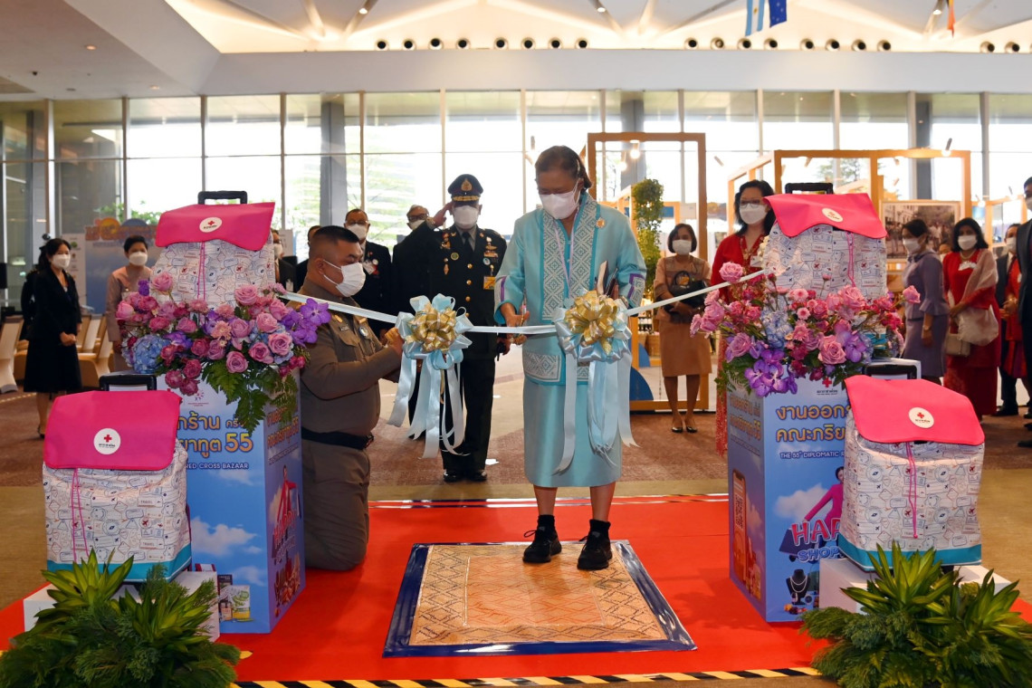 สภากาชาดไทย ร่วมกับ คณะภริยาทูตประจำประเทศไทย จัดมหกรรมสินค้านานาชาติ เพื่อการกุศลแห่งปี “งานออกร้านคณะภริยาทูต ครั้งที่ 55” (The 55th Diplomatic Red Cross Bazaar) ภายใต้แนวคิด “Happy Shopping - ชอปสนุกสุขทุกการให้” ระหว่างวันที่ 3-6 มีนาคม 2565 โดยปีนี้เป็นการจัดงานในรูปแบบ Hybrid Event ผสมผสานระหว่างงานออนกราวด์และออนไลน์ ให้สอดคล้องกับสถานการณ์การแพร่ระบาดของ เชื้อไวรัส COVID-19 โดยกำหนดจัดงานเป็นเวลา 4 วัน เพื่อลดความหนาแน่นของจำนวนผู้เข้าชมงาน อีกทั้งยังเปิดโอกาสให้นักชอปทั่วประเทศเข้าถึงและมีส่วนร่วมกับงานได้ทุกที่ ทุกเวลาผ่าน www.dpcredcrossbazaar.com ผู้ซื้อสามารถเลือกบริการจัดส่งโดยไปรษณีย์ไทย หรือเลือกบริการ แบบ Pick up มารับสินค้าด้วยตัวเองที่หน้างาน นอกจากนี้ยังมีการจำหน่ายสลากคณะภริยาทูต ชม LIVE ศิลปะการแสดงนานาชาติ หรือร่วมทำบุญในแพลตฟอร์มได้ช่วยเหลือสนับสนุนการดำเนินงานตามภารกิจของสภากาชาดไทย เป็นต้น