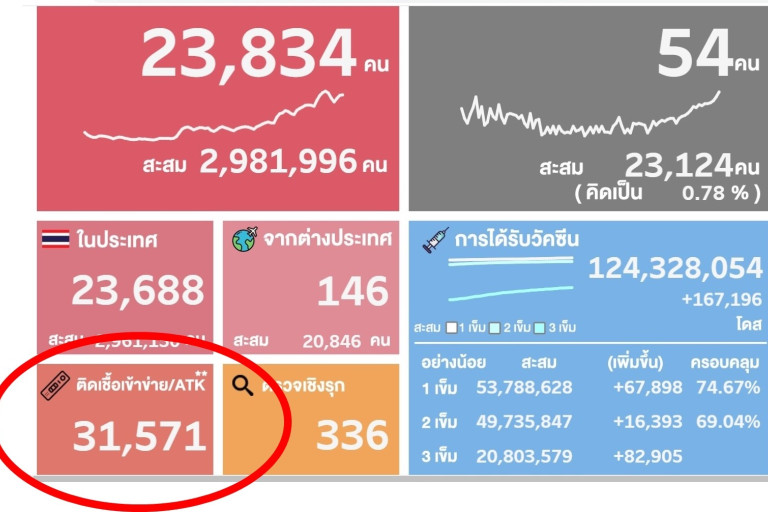 กรมควบคุมโรค กระทรวงสาธารณสุข รายงานผลการตรวจ ATK ข้อมูล ณ วันที่ 4 ก.พ.65 เวลา 07.23 น. พบผลตรวจ ATK เป็นบวกแม้จะลดลงจากเมื่อวานที่ทำสถิติสูงสุดตั้งแต่มีการระบาดมาแต่ยังถือว่าสูงมากอยู่ที่ 31,571 ราย ขณะที่จำนวนผู้ติดเชื้อรายใหม่เพิ่มขึ้นจากเมื่อวานอยู่ที่ 23,834 ราย จึงทำให้ยอดผู้ติดเชื้อรายใหม่อย่างไม่เป็นทางการจึงอยู่ที่ 55,405 ราย