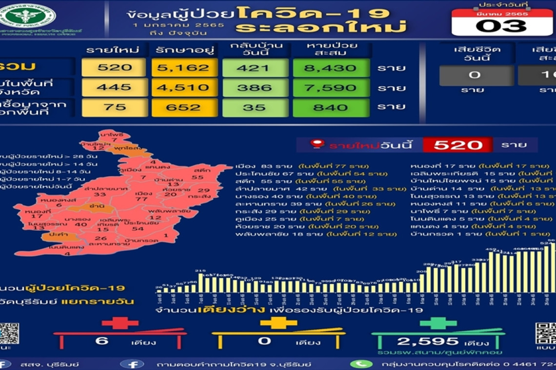 นอกจากนี้ สำนักงานสาธารณสุขจังหวัดบุรีรัมย์ ได้รายงานข้อมูลสถานการณ์แพร่ระบาดของโรคติดเชื้อไวรัสโควิด-19 ในพื้นที่ จ.บุรีรัมย์ ระลอกใหม่ ตั้งแต่วันที่ 1 ม.ค.65 ถึงวันที่ 3 มี.ค.65 ว่า ตัวเลขผู้ป่วยสะสมติดเชื้อโควิด-19 รวมทั้งสิ้น 13,608 ราย มีผู้เสียชีวิตสะสม 16 ราย หายป่วยสะสม 8,430 ราย และยังรักษาอยู่ 5,162 ราย กระจายตามโรงพยาบาลต่างๆ ในพื้นที่จังหวัด โดยสถานการณ์ผู้ป่วยติดเชื้อล่าสุด ณ วันที่ 3 มี.ค.65 เพียงวันเดียว พบผู้ป่วยยืนยันติดเชื้อโควิด-19 รายใหม่ จำนวน 520 ราย โดยพบติดเชื้อในจังหวัด 445 ราย และติดเชื้อจากนอกพื้นที่ 75 ราย กระจายอยู่ในพื้นที่ 20 อำเภอ จากทั้งจังหวัด 23 อำเภอ