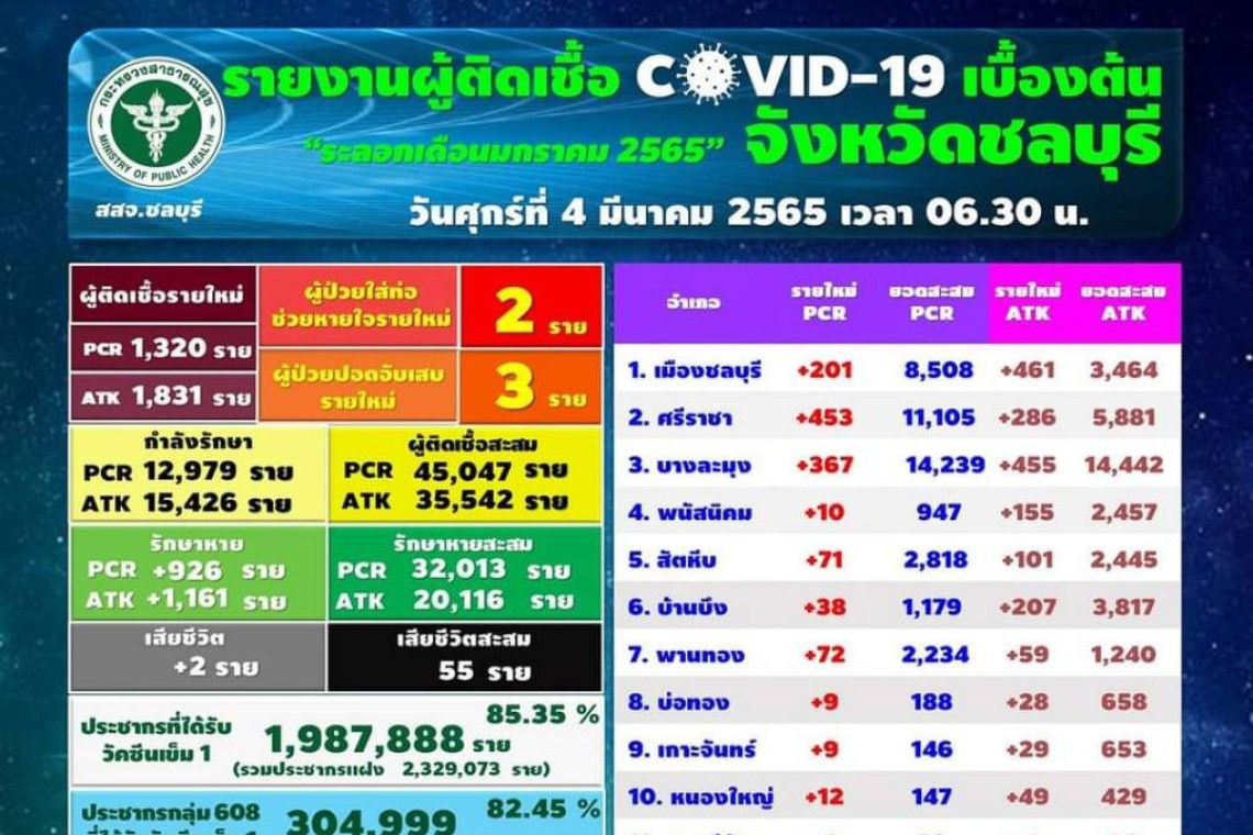 วันนี้ 4 มี.ค.65 สสจ.ชลบุรี มีรายงานพบผู้ติดเชื้อโควิด 19 รายใหม่ จำนวน 1,320 ราย เสียชีวิต 2 ราย รวมผู้ติดเชื้อสะสม 45,047 ราย พบผู้ติดเชื้อในพื้นที่ อ.ศรีราชา สูงสุด 453 ราย รองลงมา อ.บางละมุง 367 ราย และ อ.เมืองชลบุรี 201 ราย ส่วนที่เหลืออีก 8 อำเภอ ติดเชื้อลดหลั่นกันลงไปตั้งแต่ 70 กว่าราย จนถึงพื้นที่สุดท้าย อ.เกาะสีชัง 1 ราย