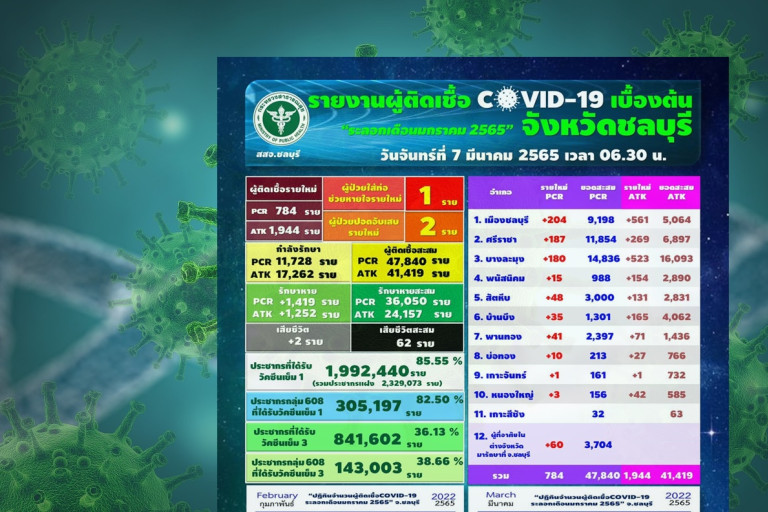 ณ วันที่ 7 มีนาคม 2565 จังหวัดชลบุรี มีผู้ฉีดวัคซีนครบ 3 เข็ม 841,602